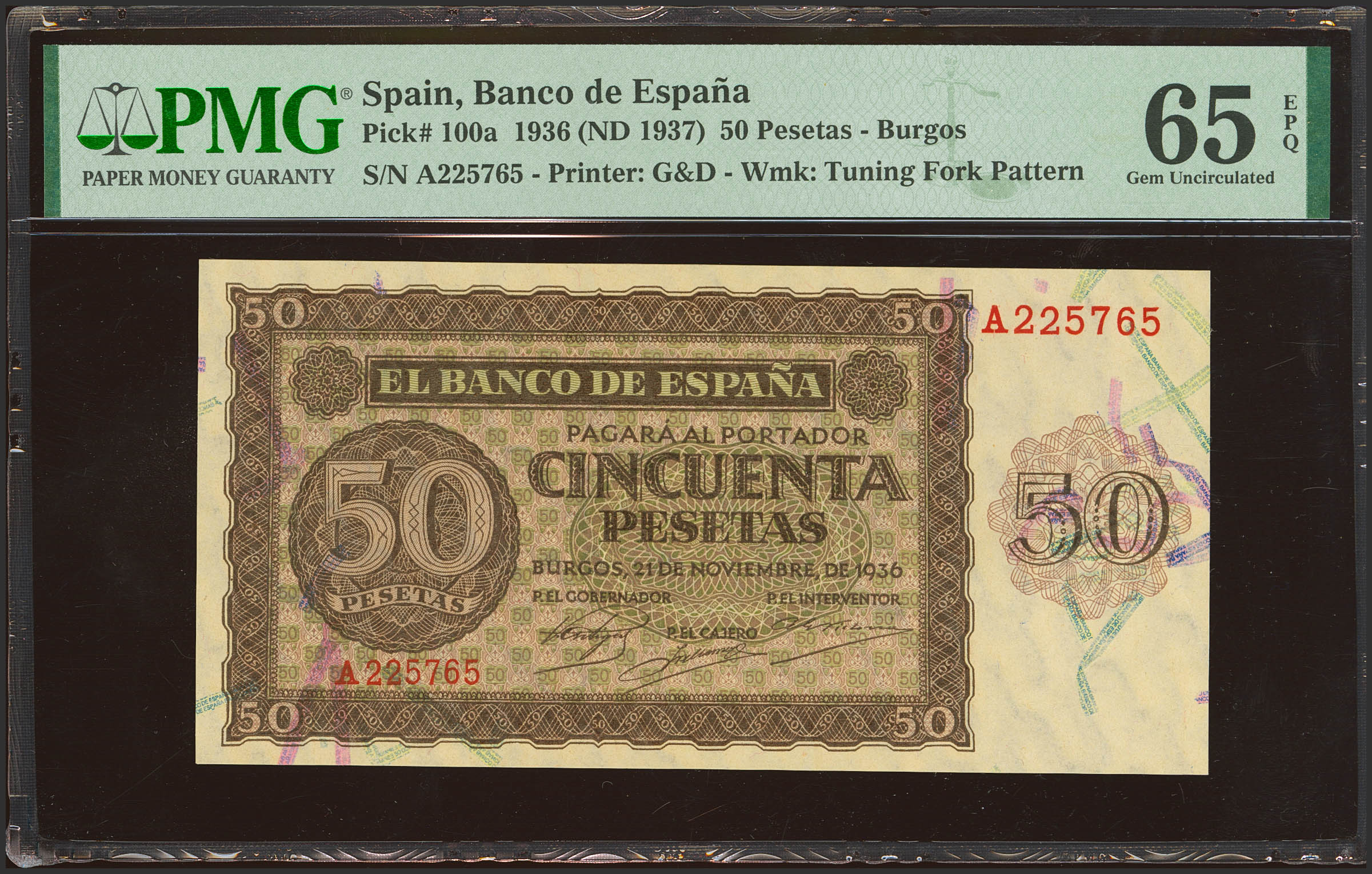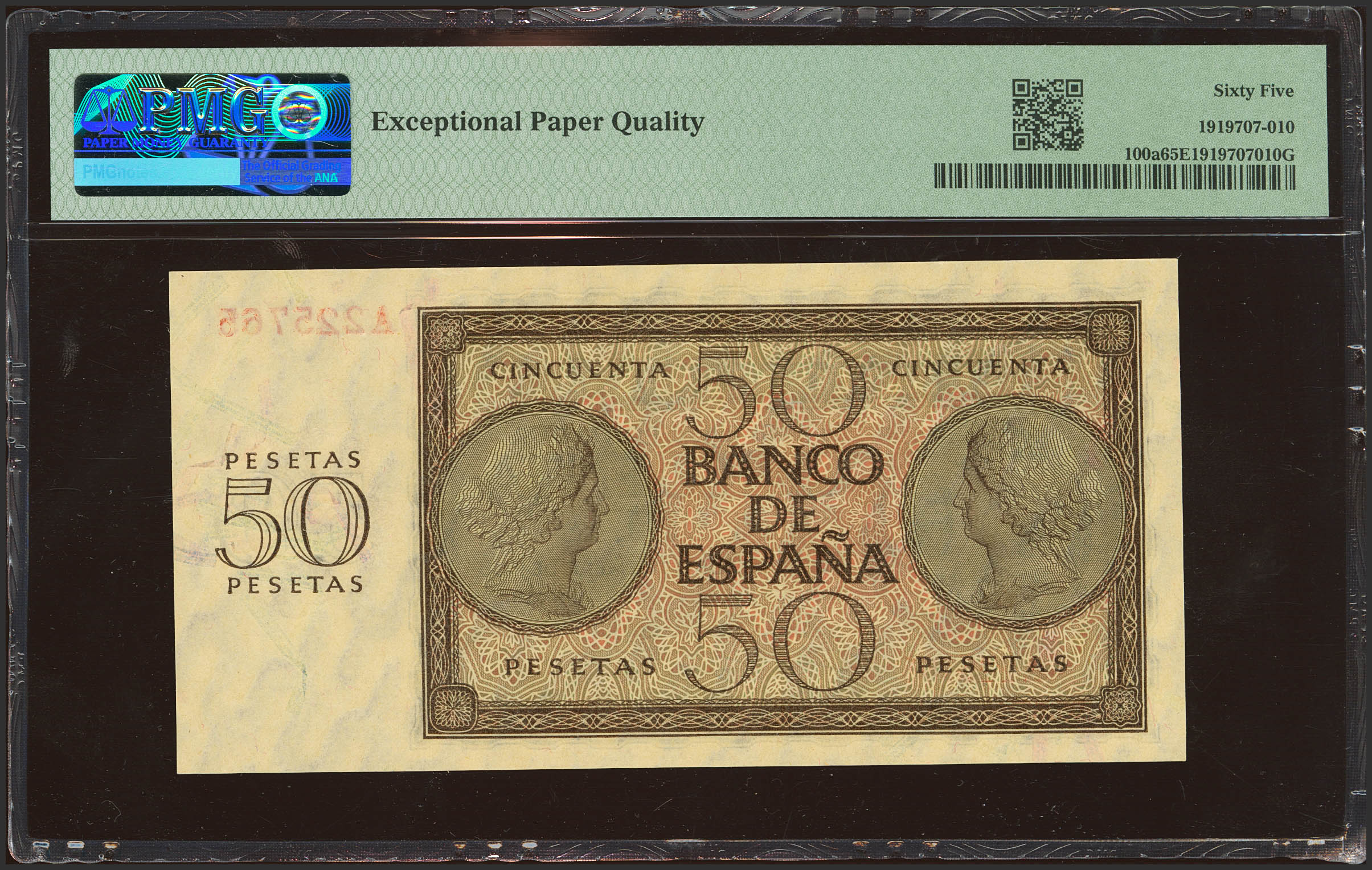 50 Pesetas. November 21, 1936. Series A. (Edifil 2023: 420, Pick: 100a). Very rare in this exceptional quality, original finish. Packaged PMG65EPQ.