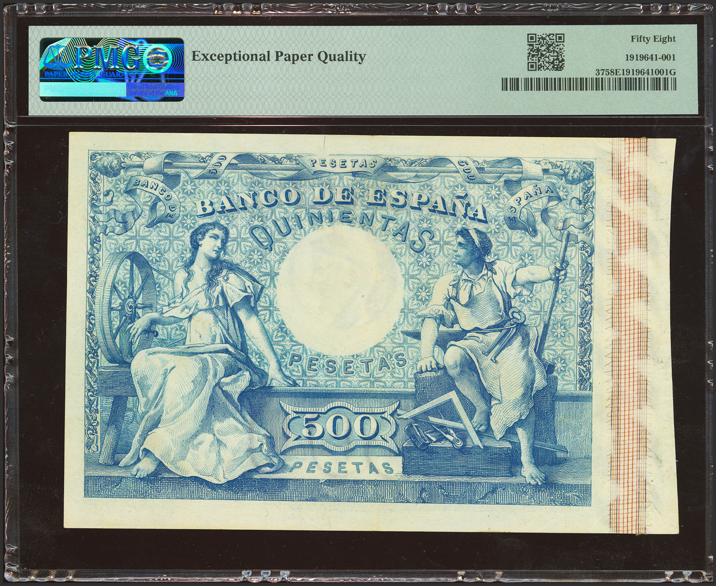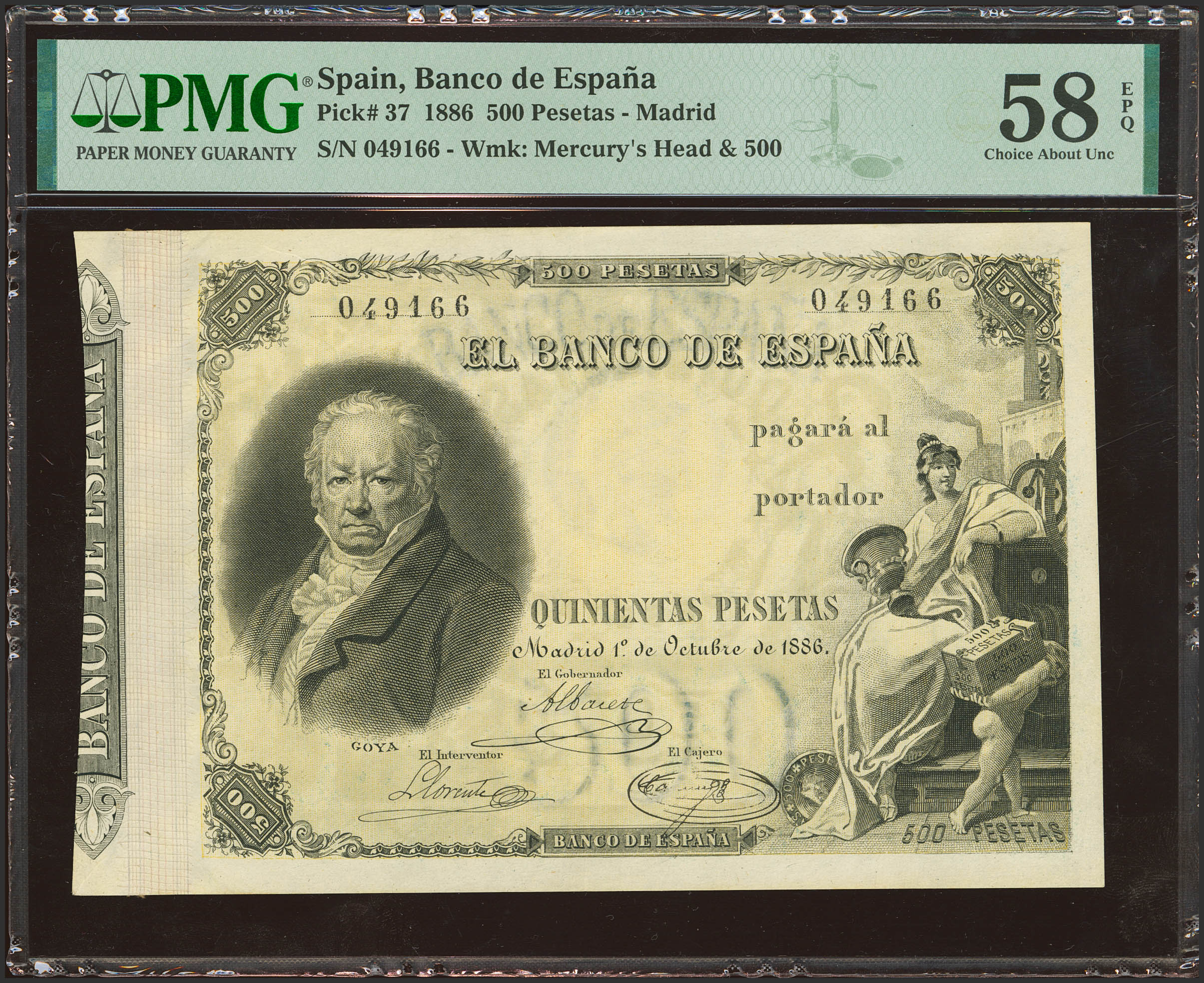 500 Pesetas. October 1, 1886. No series. (Edifil 2023: 295, Pick: 37). Extraordinarily rare, especially in this exceptional quality, with all its original finish and without repairs, undoubtedly the finest known example, a dream banknote as it is an extreme quality in a classic banknote of enormous rarity. Good Extremely Fine++. Encapsulated PMG58EPQ. (To give an idea of the rarity, as of November 1, 2024, this banknote is the highest graded in PMG of the five existing ones). Accustomed as we are to handling banknotes today, it's difficult to understand that in the 19th century, some of them were not intended for circulation among ordinary citizens. This is the case with these 500 pesetas from 1886, a banknote intended for the nobility and payments between large merchants. Skilled and well-paid workers in the Bank of Spain workshop took months to earn this money. Even the engravers, always highly regarded in the industry, couldn't manage to earn one of these notes every month; only the chief engraver was lucky enough to get one. It seems somewhat contradictory that this 1886 issue was the first to unify the aesthetics around Goya, with the aim of providing a solid, common image for all banknotes now that they were going to circulate throughout the country; most mortals could barely see or use them. A 500-peseta note from 1886 could buy about 5,000 eggs… Thus, it doesn't seem that even a 25- or 50-peseta note would have found regular circulation in the retail trade; a few pesetas were enough to make the purchase. Considering the current price of a dozen eggs, we could think of 500 pesetas from 1886 as the equivalent of about 1,000 euros. However, prices and wages were not as they are today. A master bricklayer wouldn't see such a note for more than a month, and a laborer could only dream of collecting one after many months of work without any expense. A 500-peseta note from that era would buy five elegant, custom-made men's suits, with money left over. Considering its equivalent in 100-peseta gold coins, whose convertibility at the time was quite difficult given the Bank of Spain's resistance to doing so since the early 1880s, we'd be talking about about 160 grams of gold, about ten thousand euros at today's price. Crazy. Convertibility into silver would be more likely, with its equivalent being about 3.2 kilos of silver, currently worth between two thousand and two thousand five hundred euros. In essence, we could assume that this note would be equivalent to one currently worth between one thousand five hundred and three thousand five hundred euros—an incredible amount of money. As for the specimen we're offering, it's the best preserved of all those we know of, both inside and outside the PMG registry. A superlative gem.