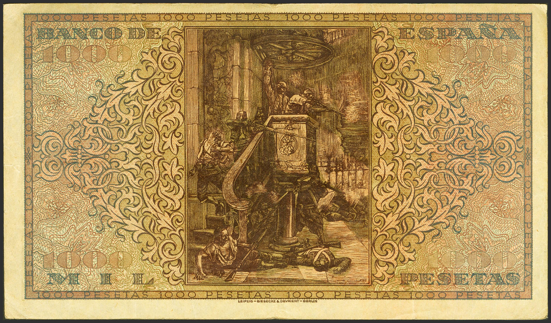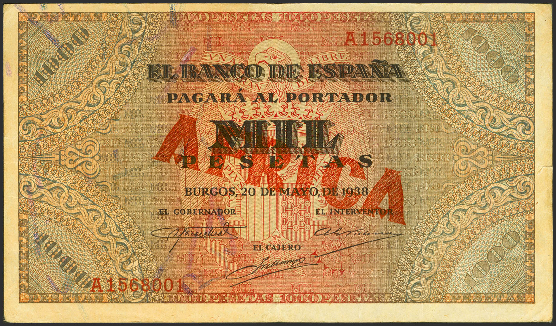 1000 Pesetas. May 20, 1938. Series A. (Edifil 2023: 434). AFRICA typographical overprint in red. Extremely rare, with small tears on the right margin. It matches the one photographed in the Edifil catalog and the one auctioned at the Caja Madrid auction. VF.