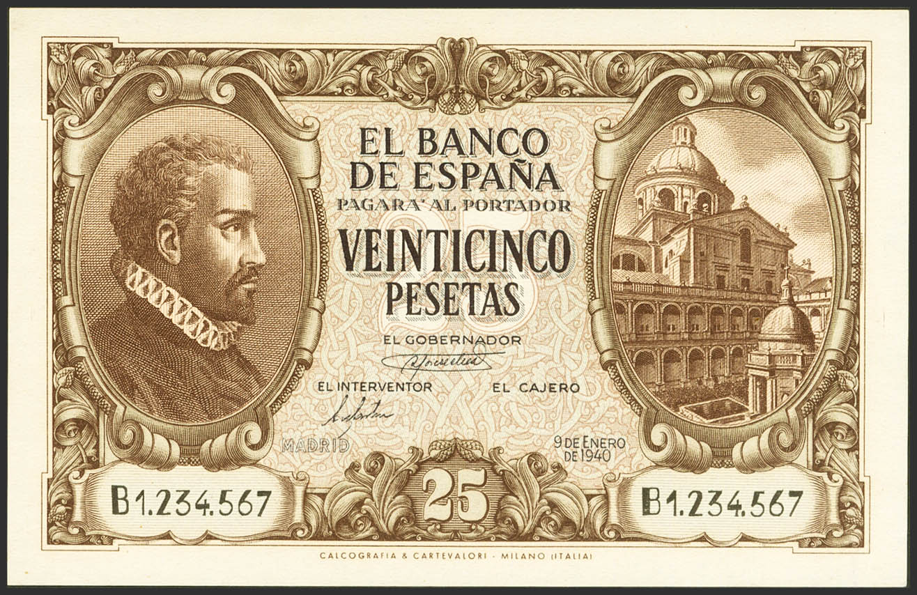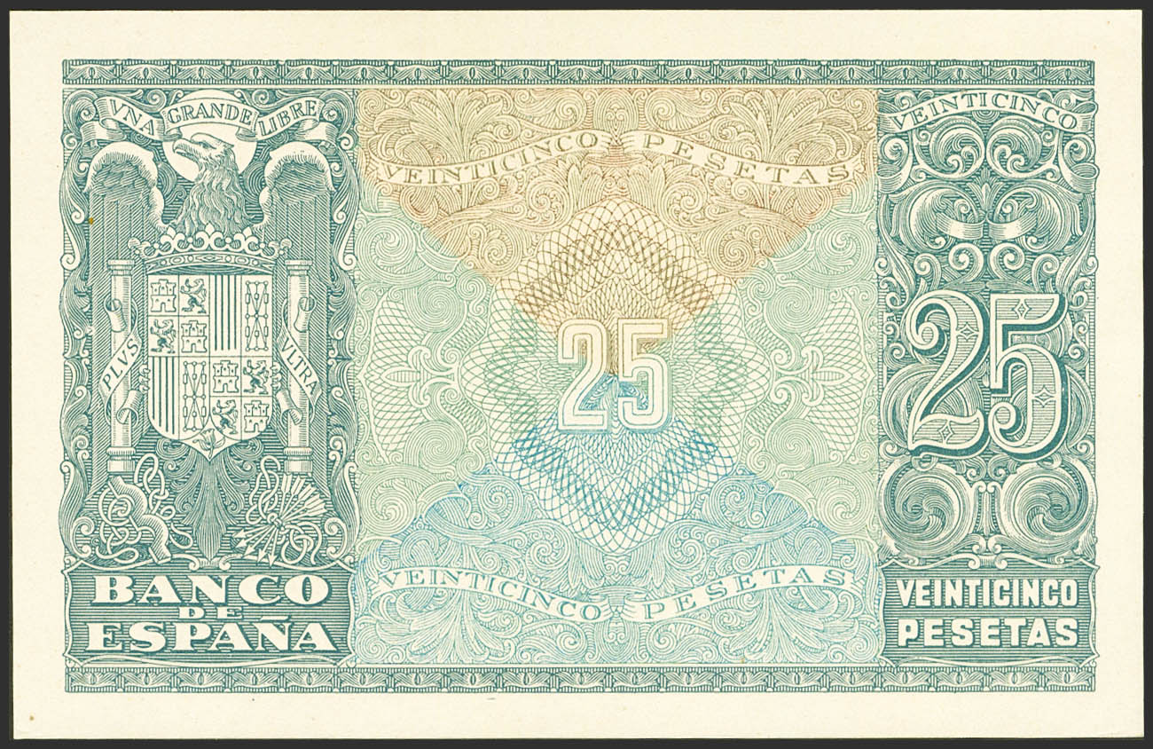 25 Pesetas. January 9, 1940. Proof of the obverse and reverse, in a non-final color, and numbered A1234567 (consecutive issues). (Edifil 2023: 436P, 436Pa). Extraordinarily rare, previously mounted on cardboard. Uncirculated--.