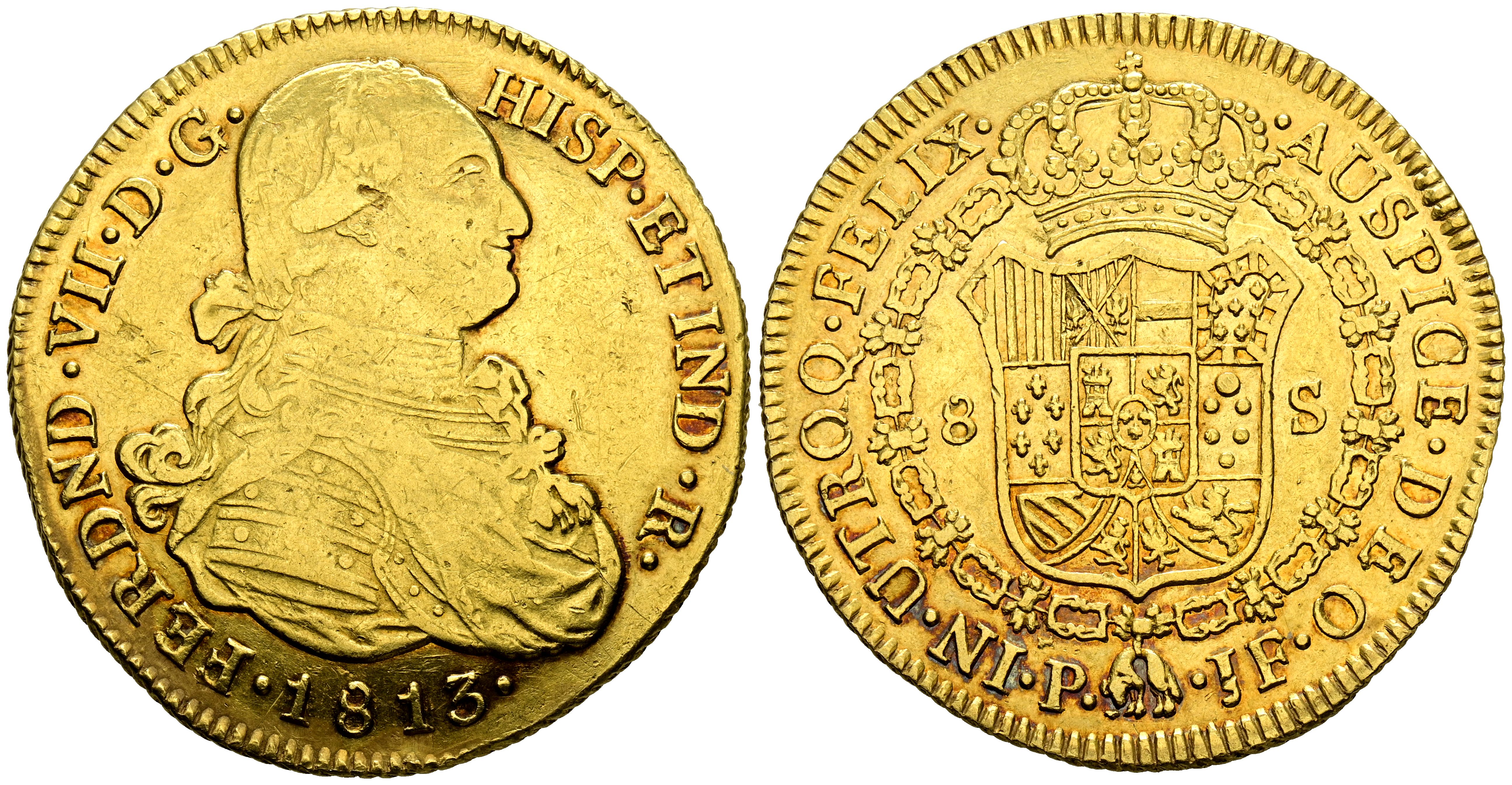 FERDINAND VII (1808-1833). 8 Shields. (Au. 26.53g/37mm). 1813. Popayán JF. (Cal-2019-1815). Very Fine.