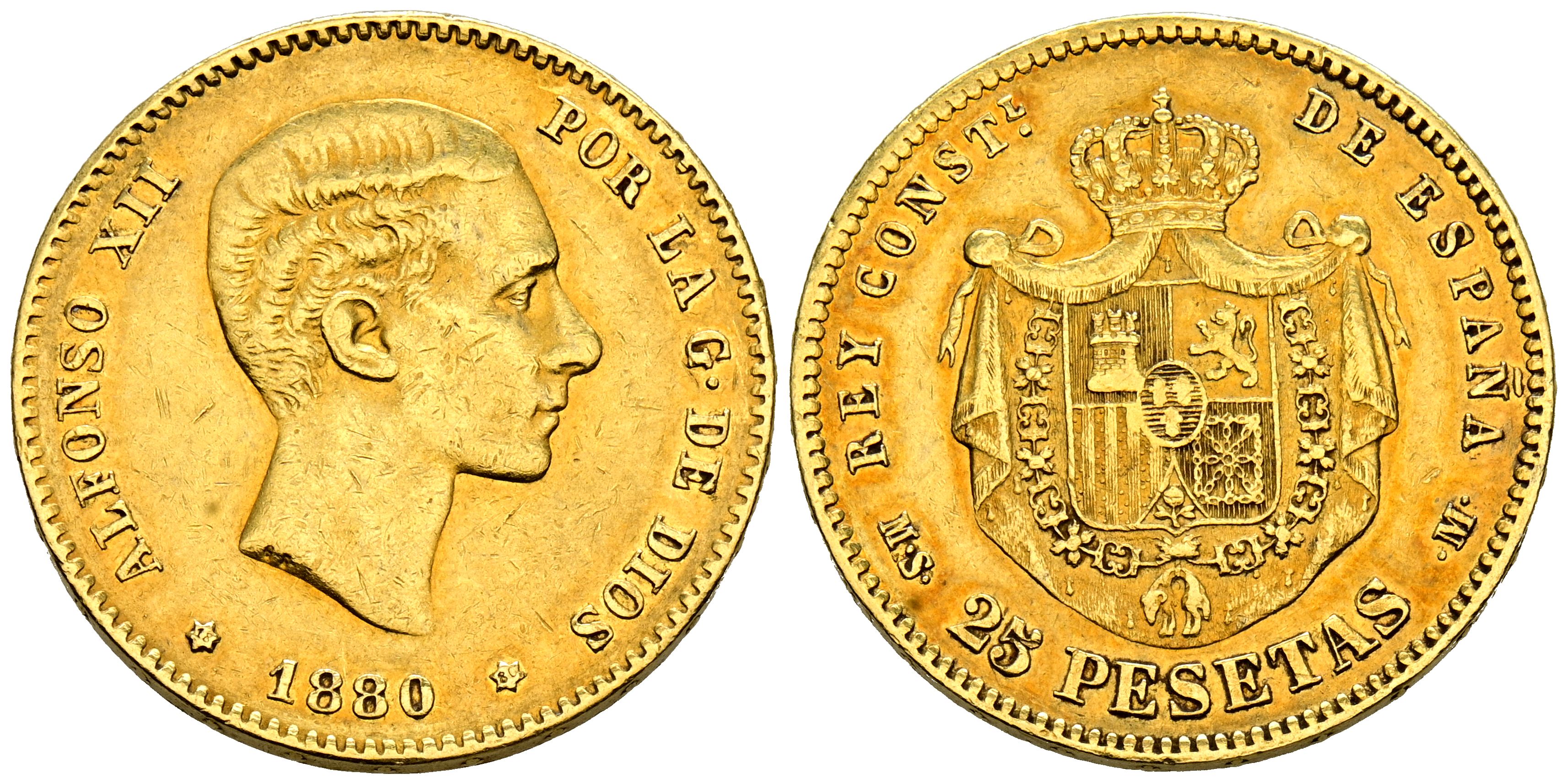 ALFONSO XII (1874-1885). 25 Pesetas. (Au. 8.04g/24mm). 1880 *18-80. Madrid MSM. (Cal-2019-79). Very Fine. Nice patina.