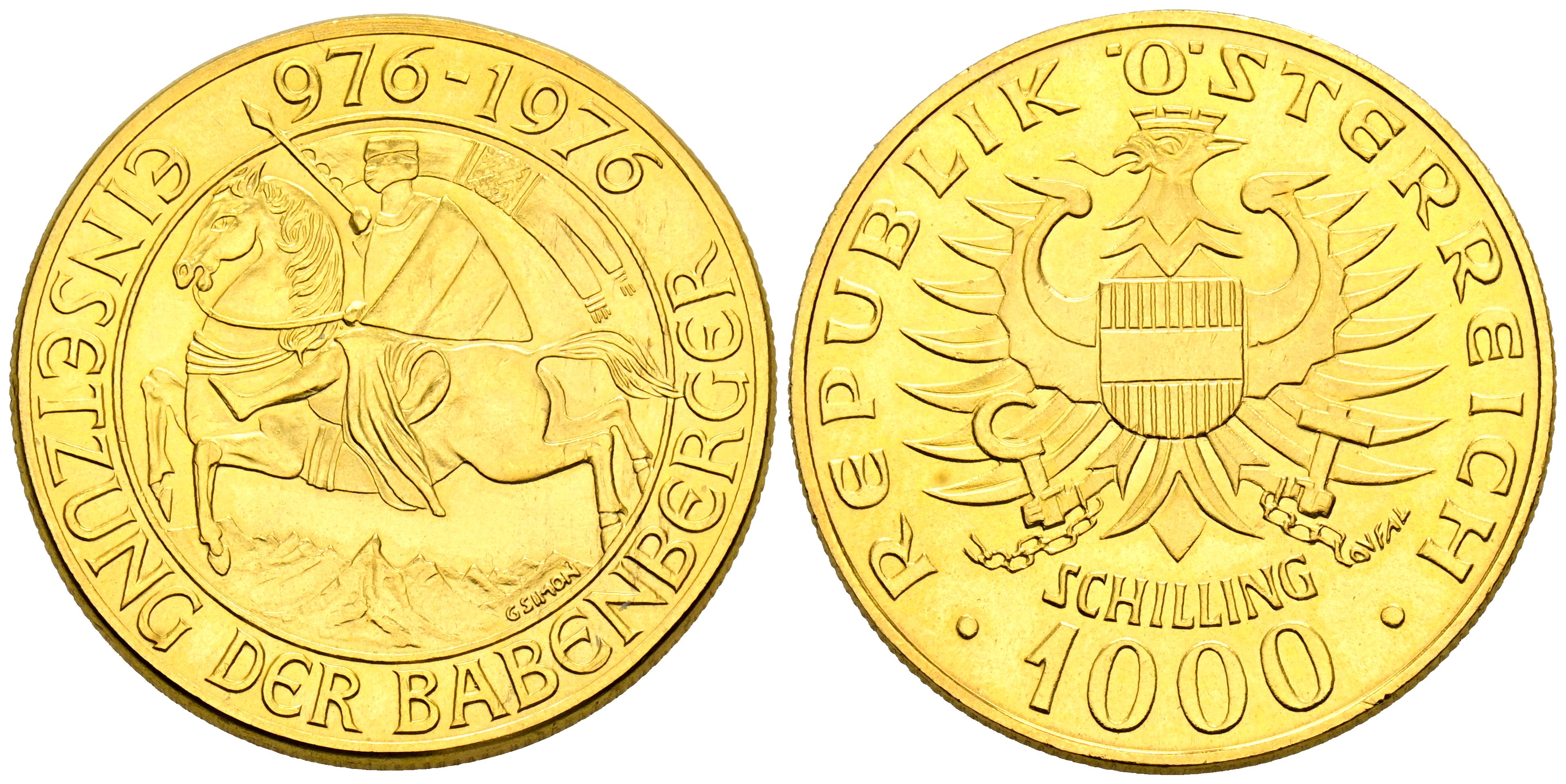 English AUSTRIA. 1000 Schilling. (Au. 13.52g/27mm). 1976. 1000th Anniversary of the Babenbeg Dynasty. (Km#2933). Uncirculated.