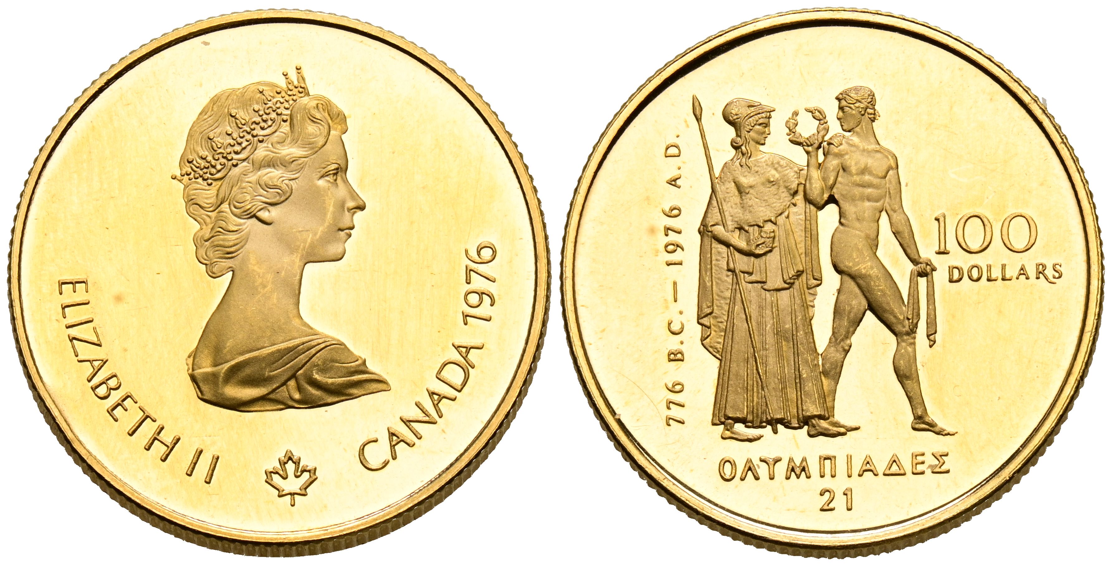 CANADA. 100 Dollars. (Au. 16.96g/25mm). 1976. Elizabeth II. Montreal 76 Winter Olympics. (Km#116). PROOF. Light dent.