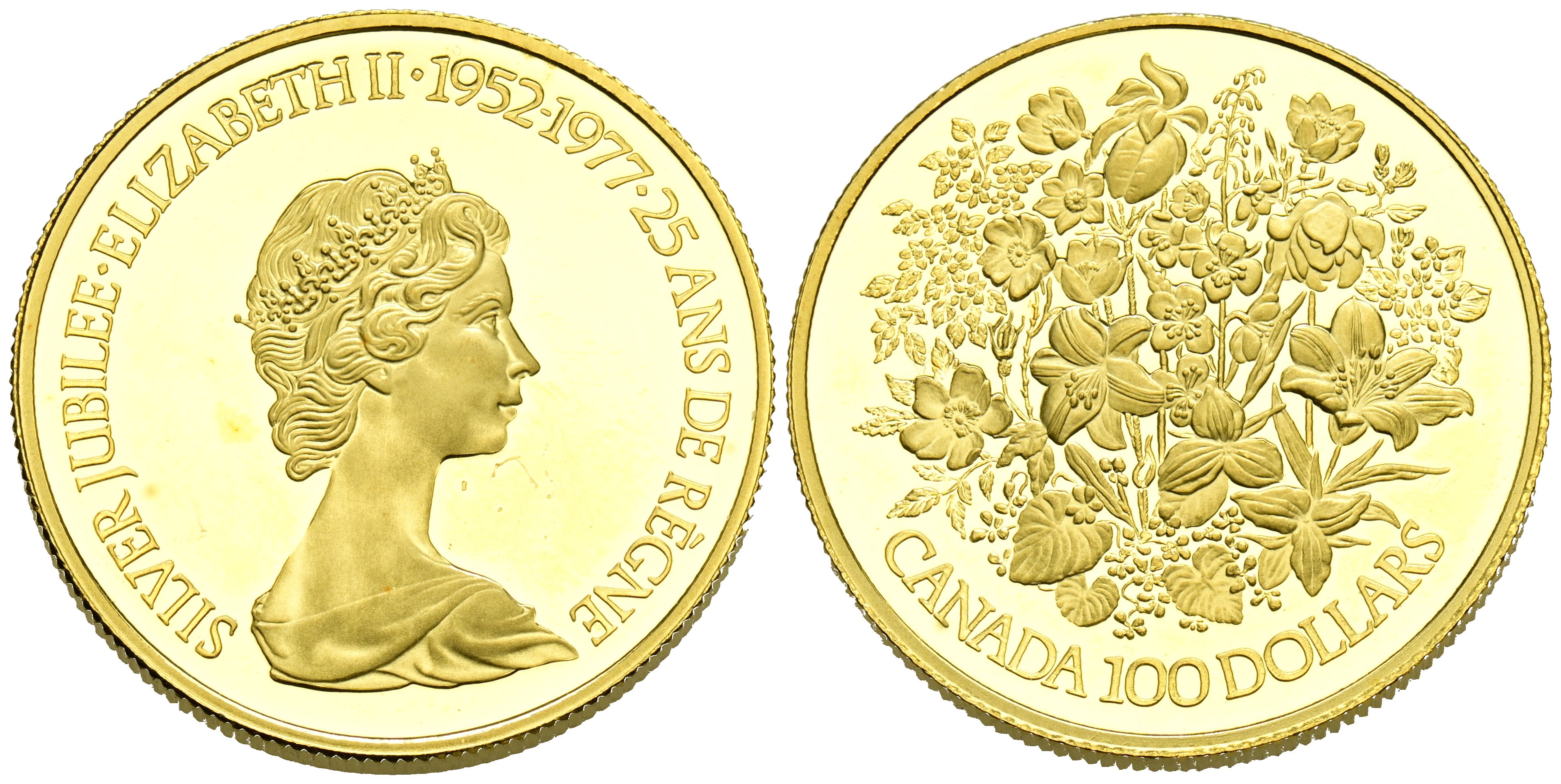 CANADA. 100 Dollars. (Au. 16.90g/27mm). 1977. 25th Anniversary of the Accession of Elizabeth II. (Km#119). PROOF.