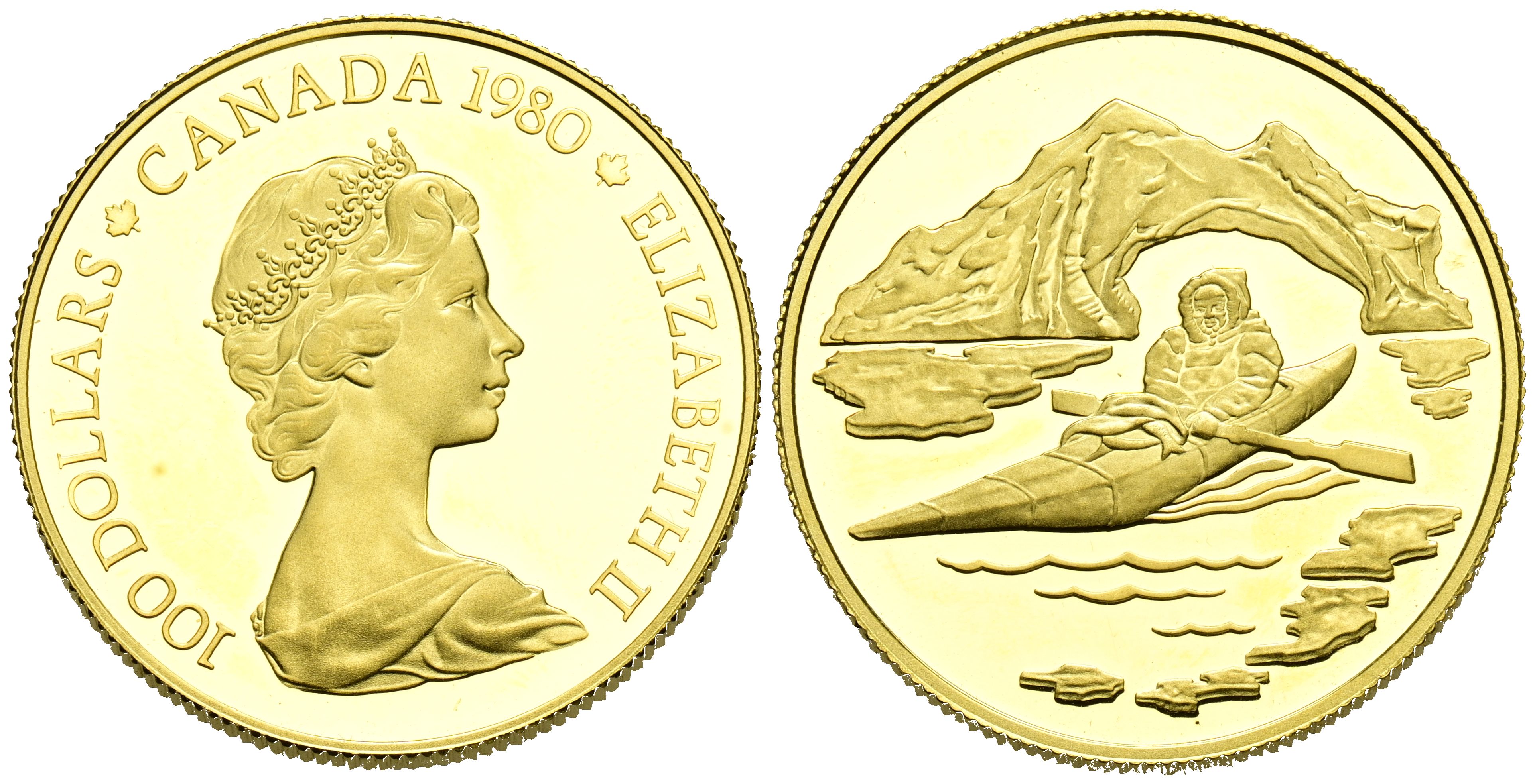 CANADA. 100 Dollars. (Au. 16.95g/27mm). 1980. Arctic Territories. Inuit Kayaking. (Km#129). PROOF.