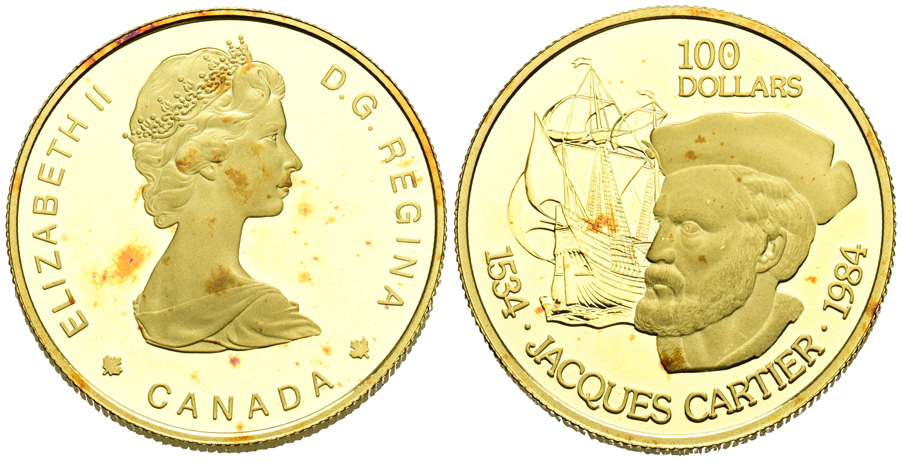 CANADA. 100 Dollars. (Au. 16.88g/27mm). 1984. Jacques Cartier. (Km#142). PROOF. Minor rust stains.