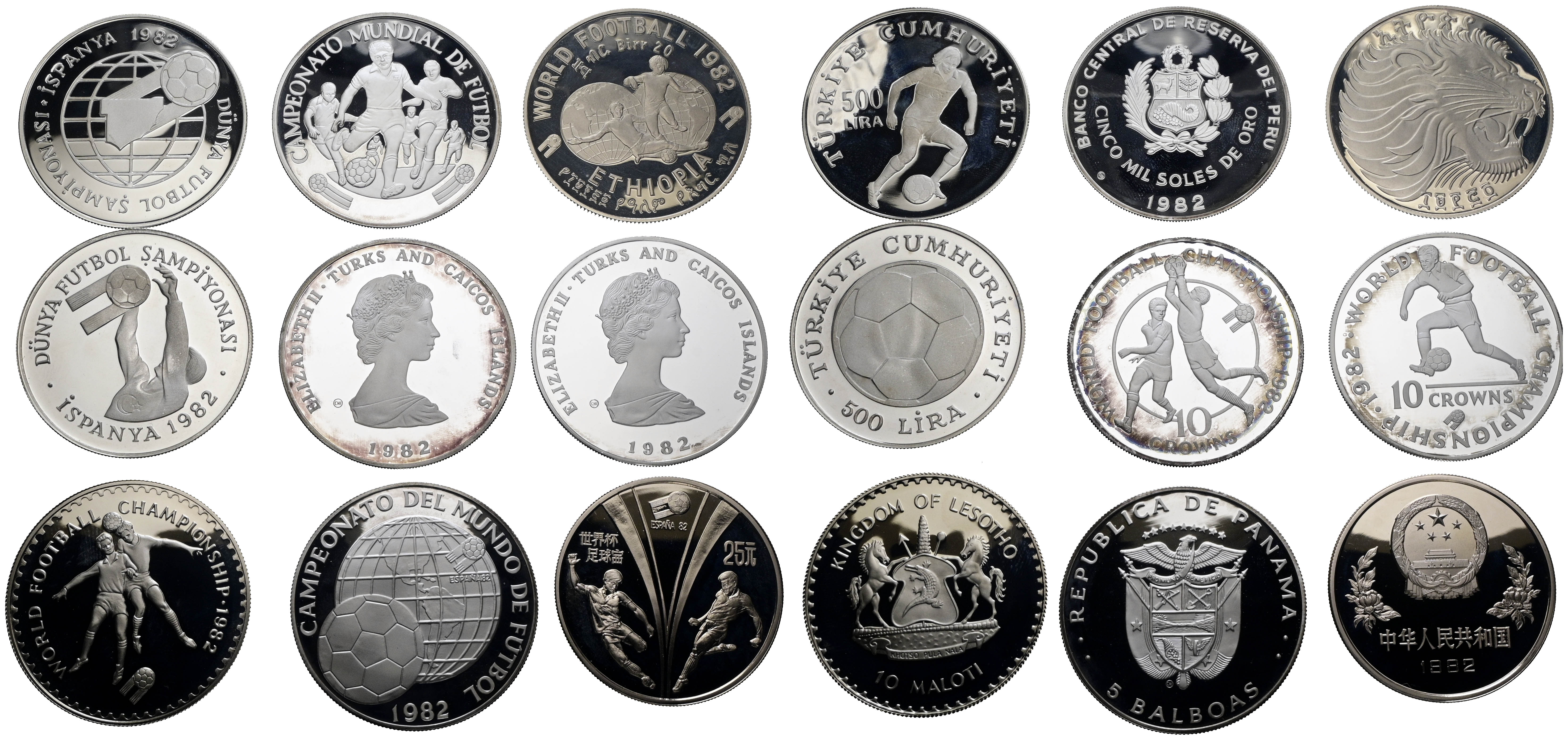 WORLD COIN. An interesting and beautiful set of 17 silver coins from different countries, themed on the 1982 World Cup in Spain. Includes a curious silver medal/calendar. No duplicates. Unfinished and Proof coins. READY TO EXAMINE.