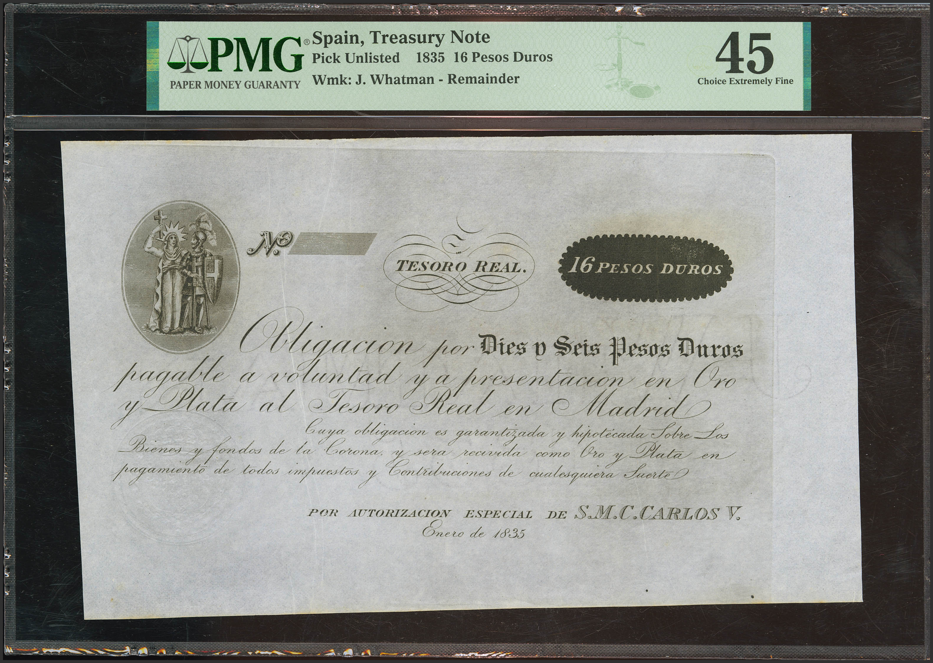 English 16 Pesos Duros. Royal Treasury. January 1835. Unnumbered. (Edifil 2023: 19). Extremely Fine-. Encapsulated PMG45.