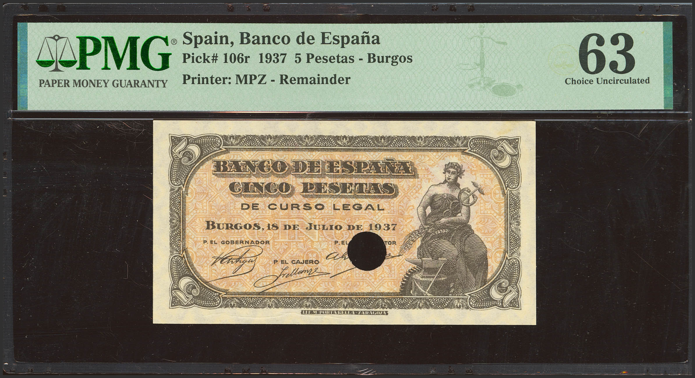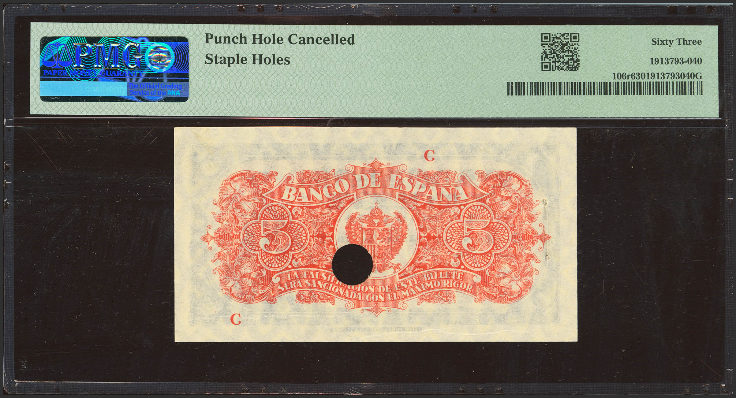 5 Pesetas. June 18, 1937. Series C, last series issued, unnumbered and perforated. (Edifil 2023: 424a). Very rare. Staple points are always present on perforated banknotes. Uncirculated-. Encapsulated PMG63 (punch hole, staple holes).
