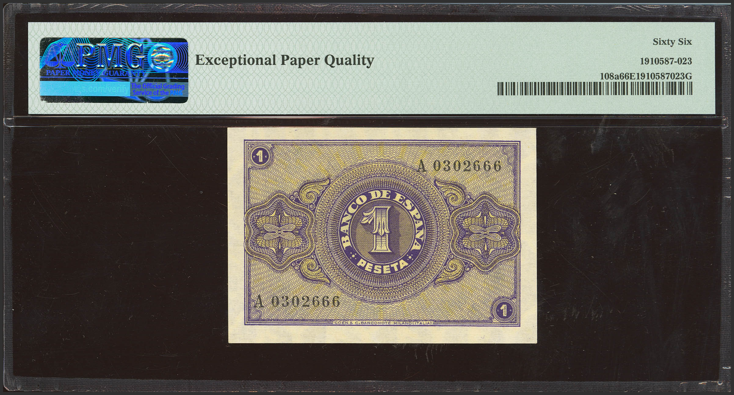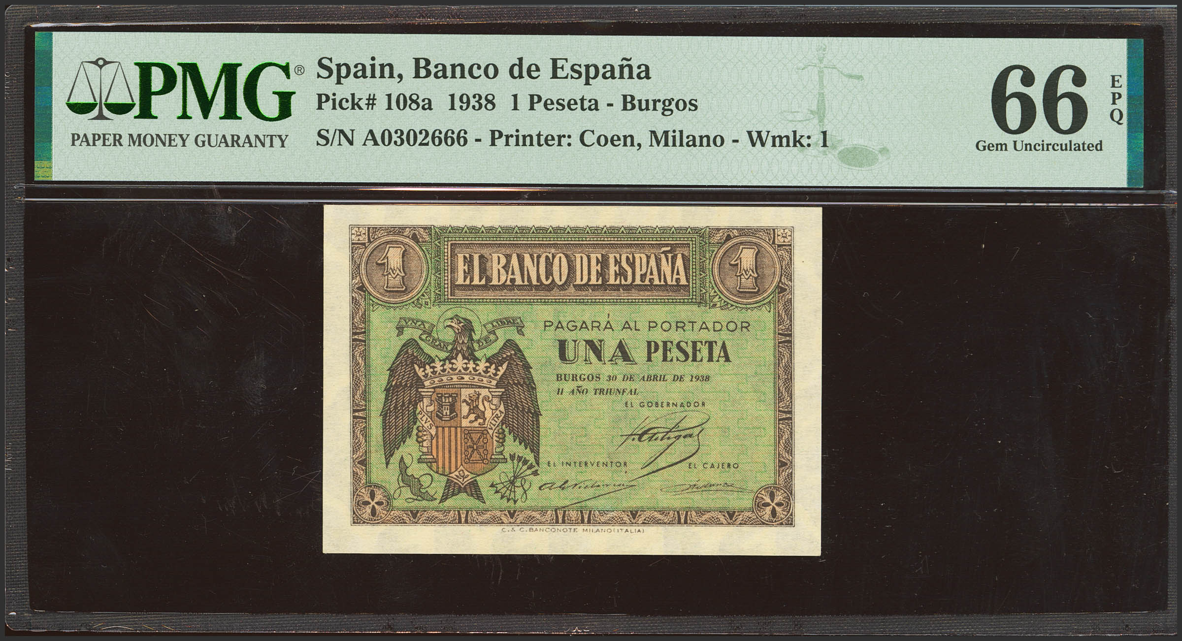 1 Pesetas. April 30, 1938. Series A. (Edifil 2023: 428, Pick: 108a). Original size. Uncirculated. Encapsulated PMG66EPQ.
