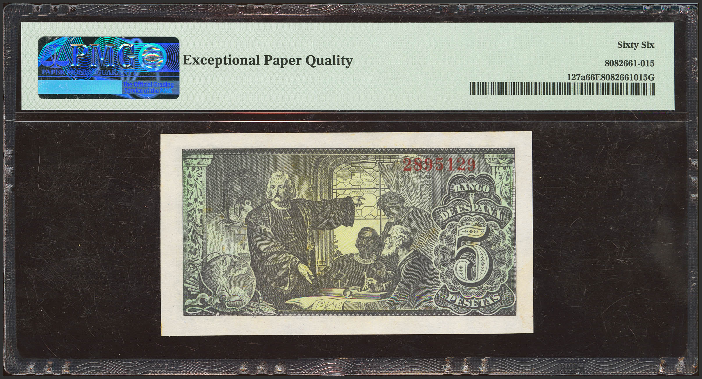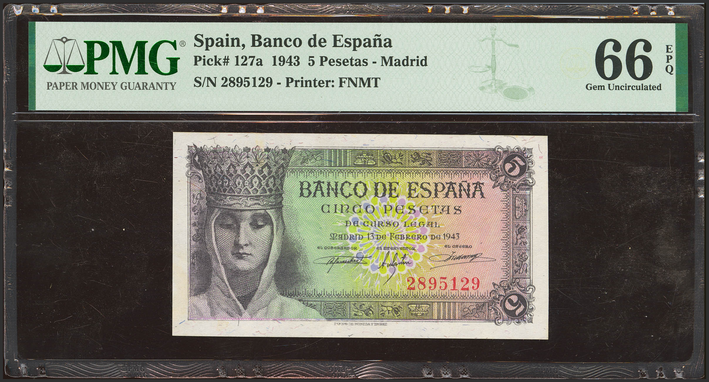 5 Pesetas. February 13, 1943. No serial number. (Edifil 2023: 446, Pick: 127a). Unusual in this exceptional quality, original sizing. Unused. Encapsulated PMG66EPQ.