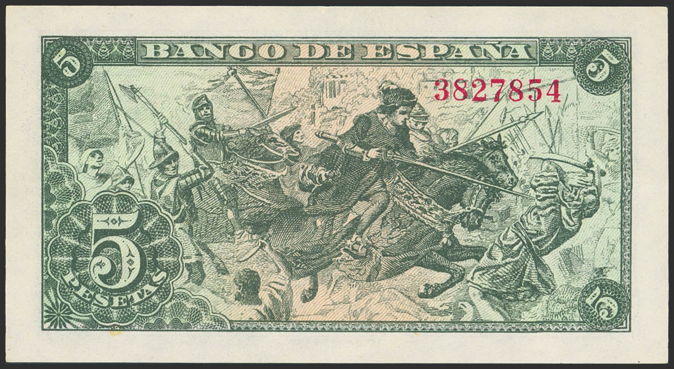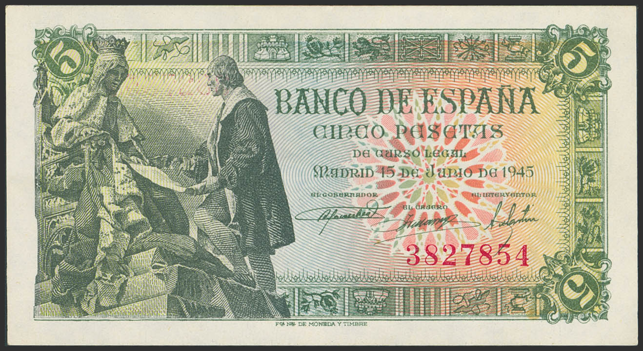 English 5 Pesetas. June 15, 1945. No series. (Edifil 2023: 449). Original size. Uncirculated-.