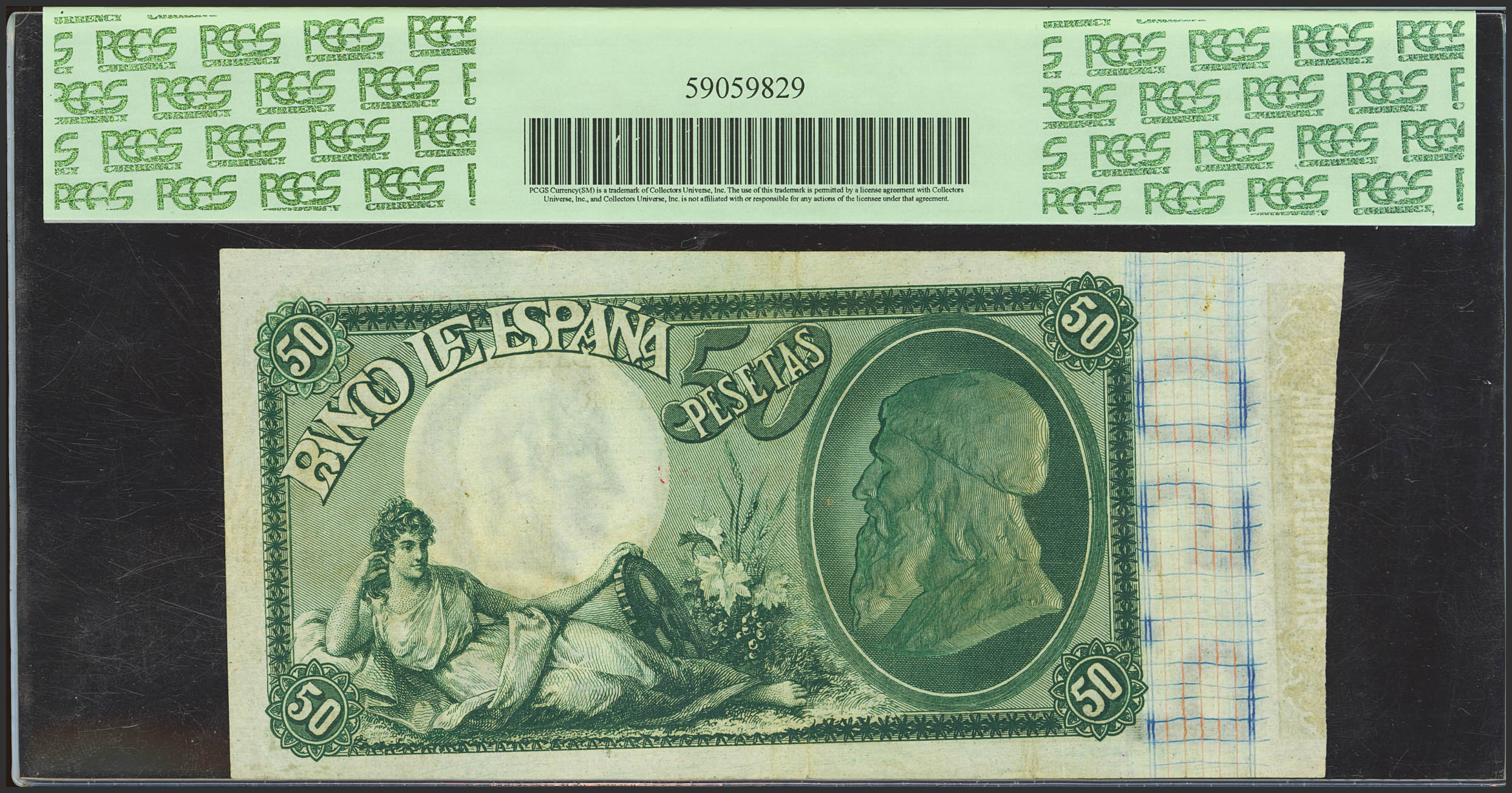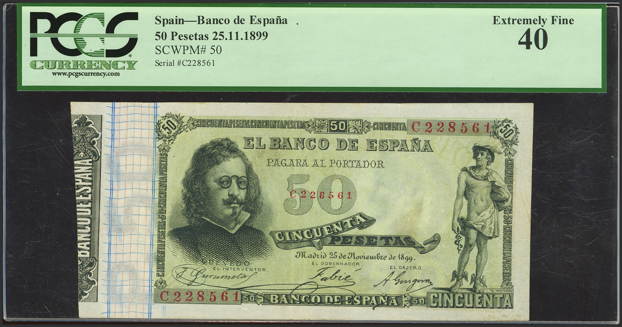 50 Pesetas. November 25, 1899. Series C. (Edifil 2023: 307a, Pick: 50). Rare in this condition, especially without any repairs. Uncut. Encapsulated in PCGS40.