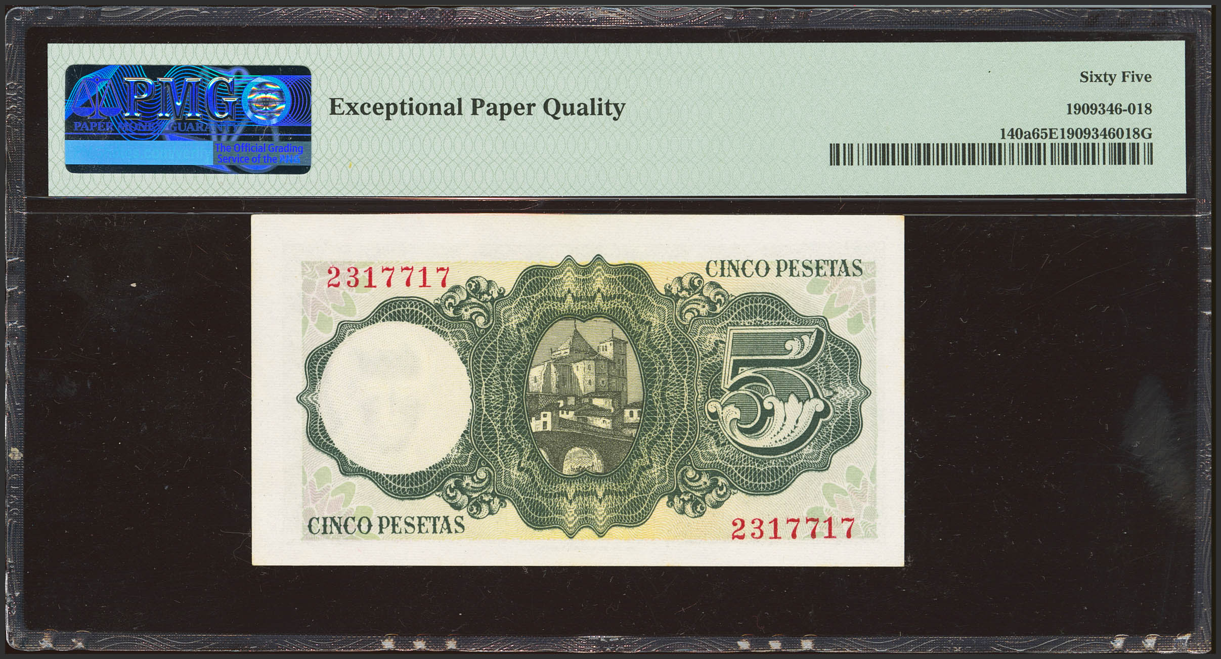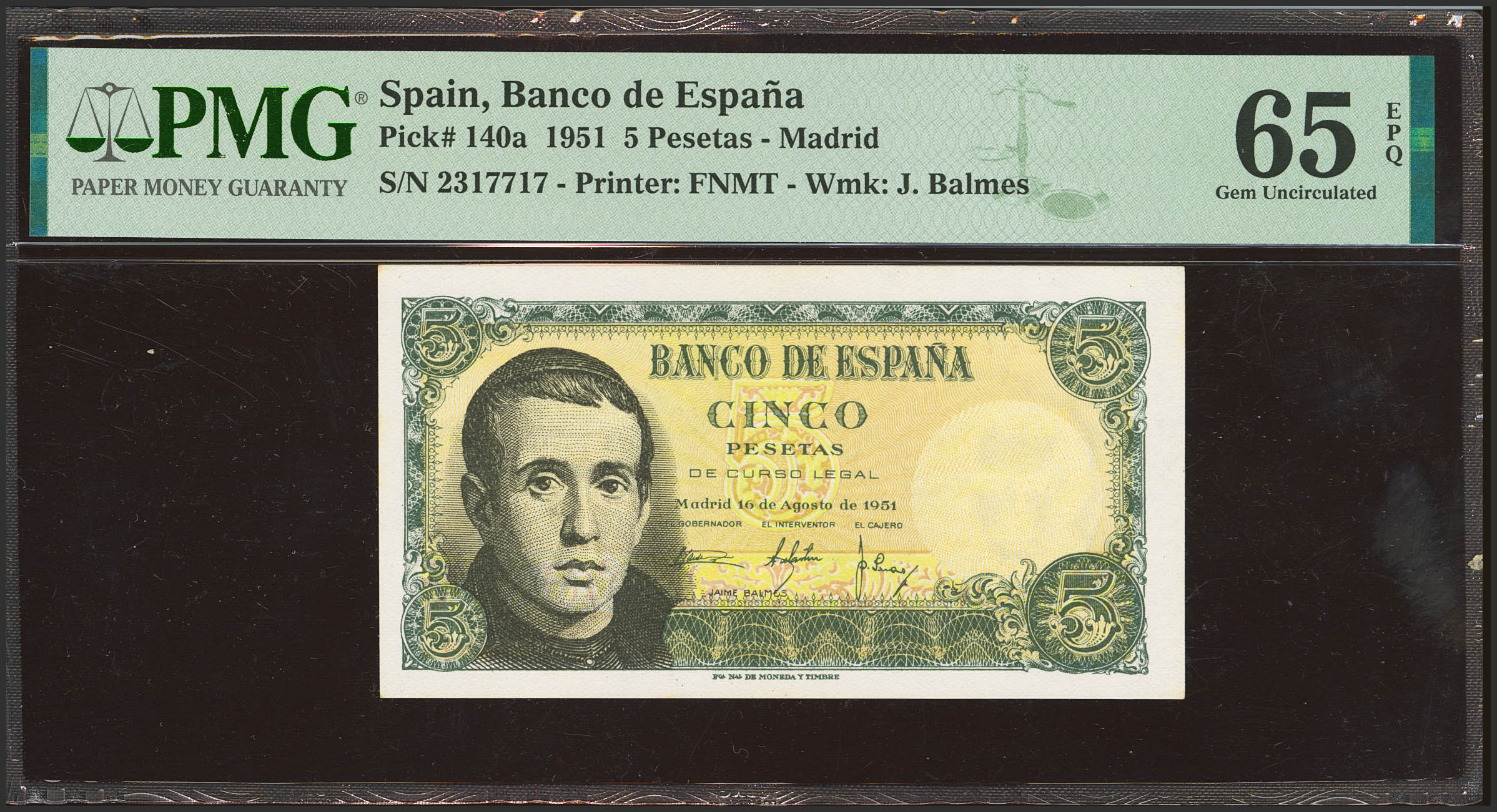 English 5 Pesetas. August 16, 1951. No serial number. (Edifil 2023: 459, Pick: 140a). Original size. Unopened. PMG65EPQ encapsulation.