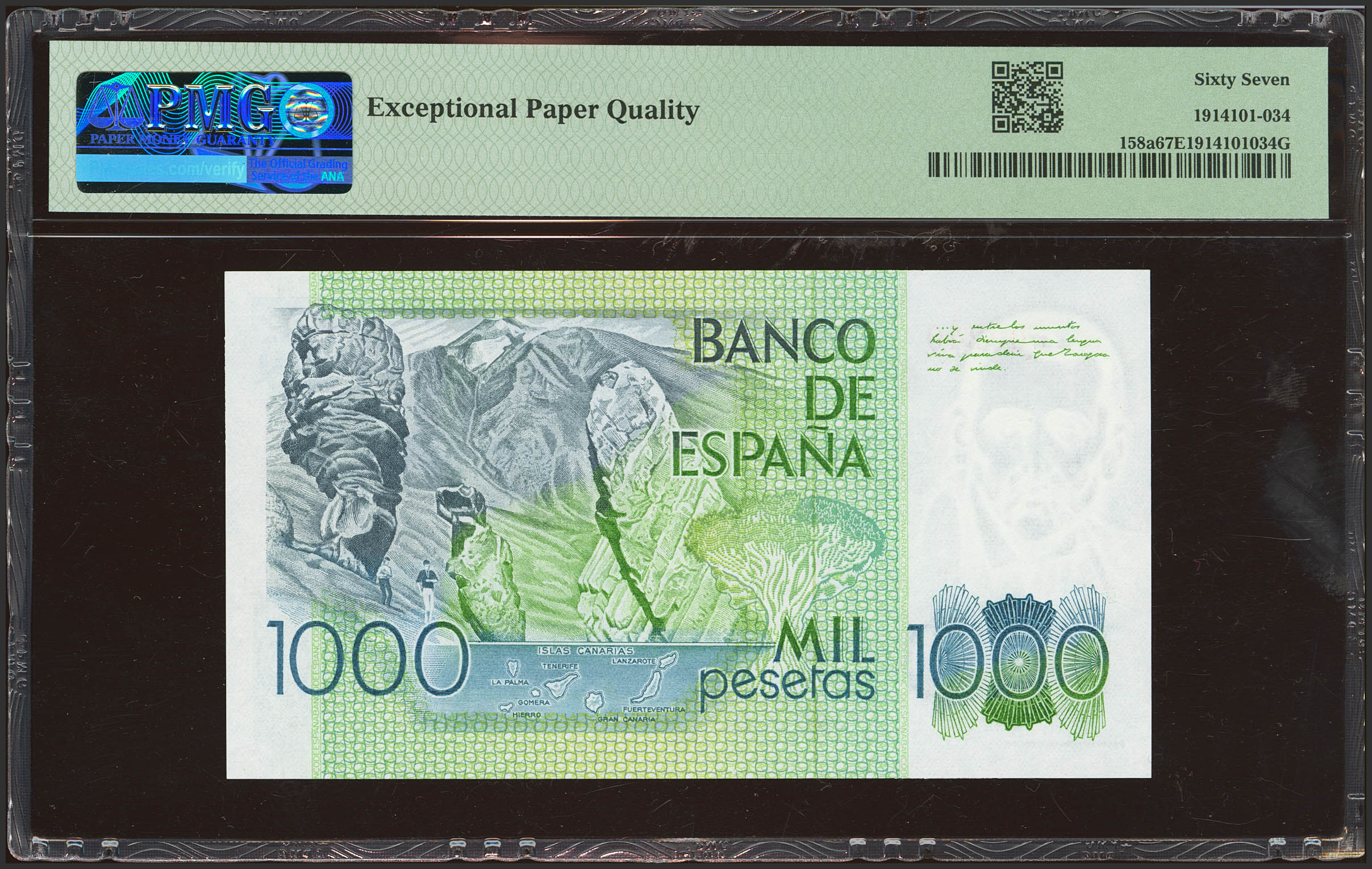 1000 Pesetas. October 23, 1979. No serial number and very low numbering (No. 000240). (Edifil 2023: 477, Pick: 158a). Uncirculated. Encapsulated PMG67EPQ.