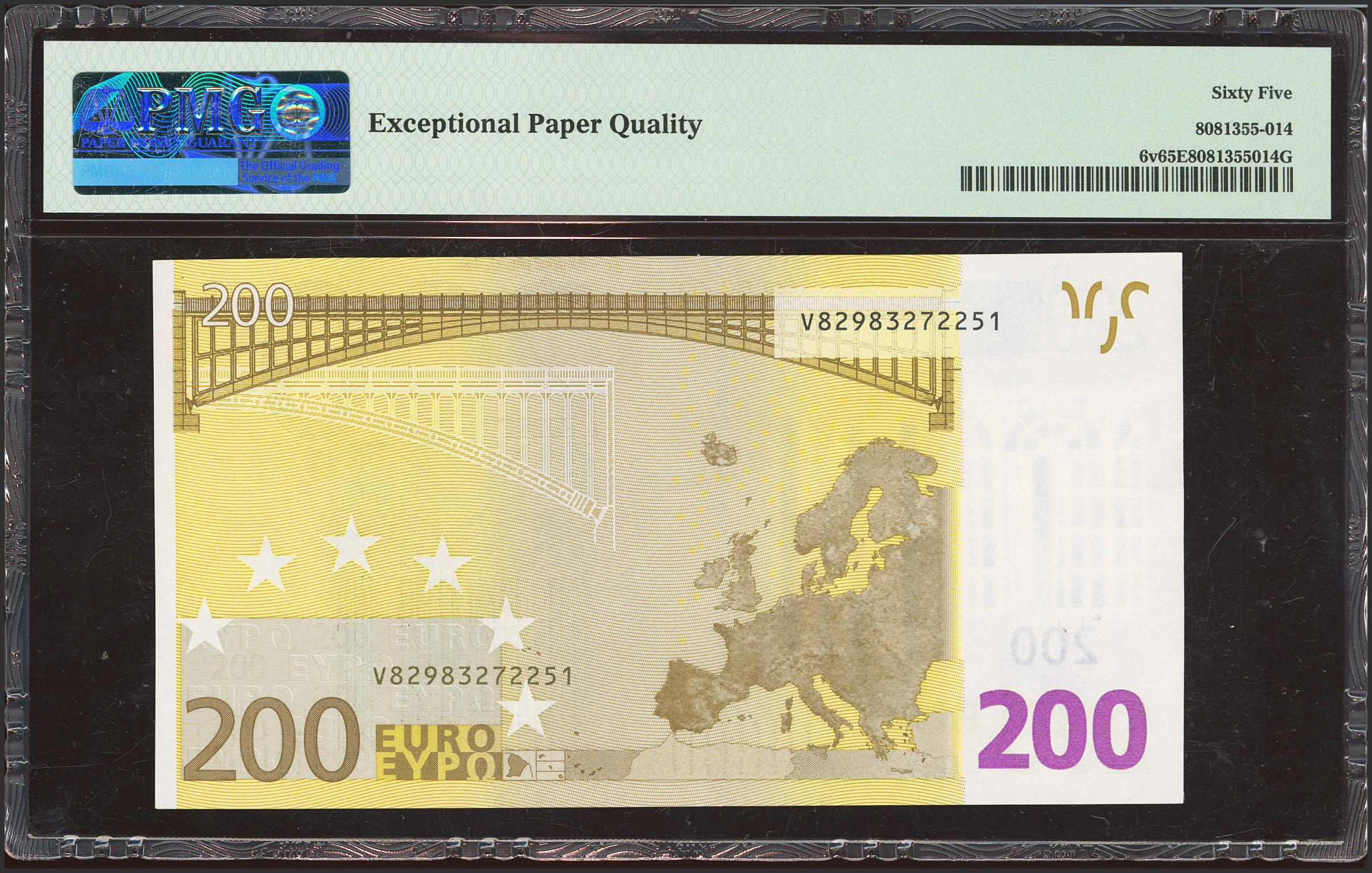 200 Euros. January 1, 2002. Duisenberg. Series V (Spain). (Edifil 2023: 491, Pick: 6v). Uncirculated. PMG65EPQ encapsulation.