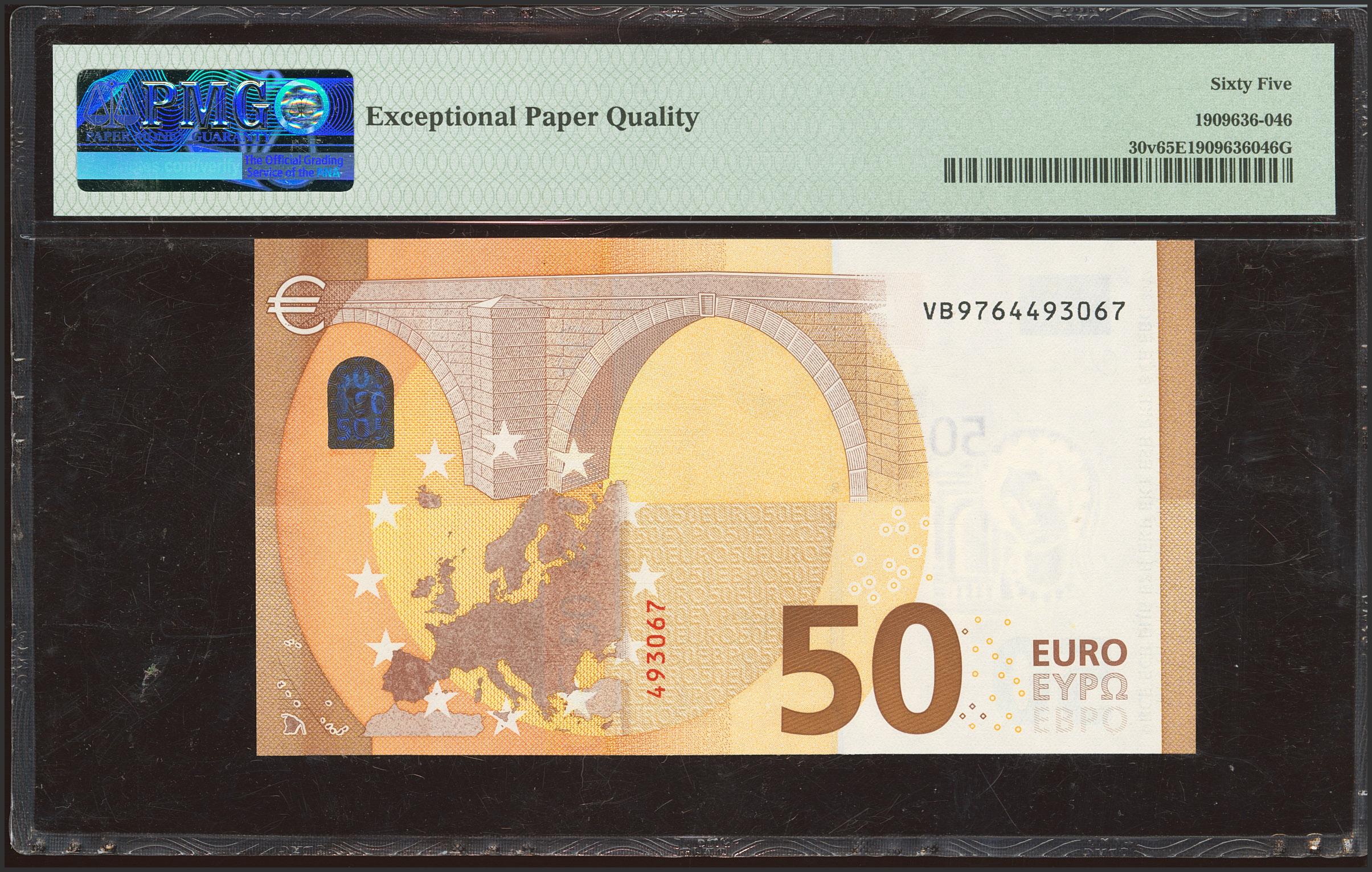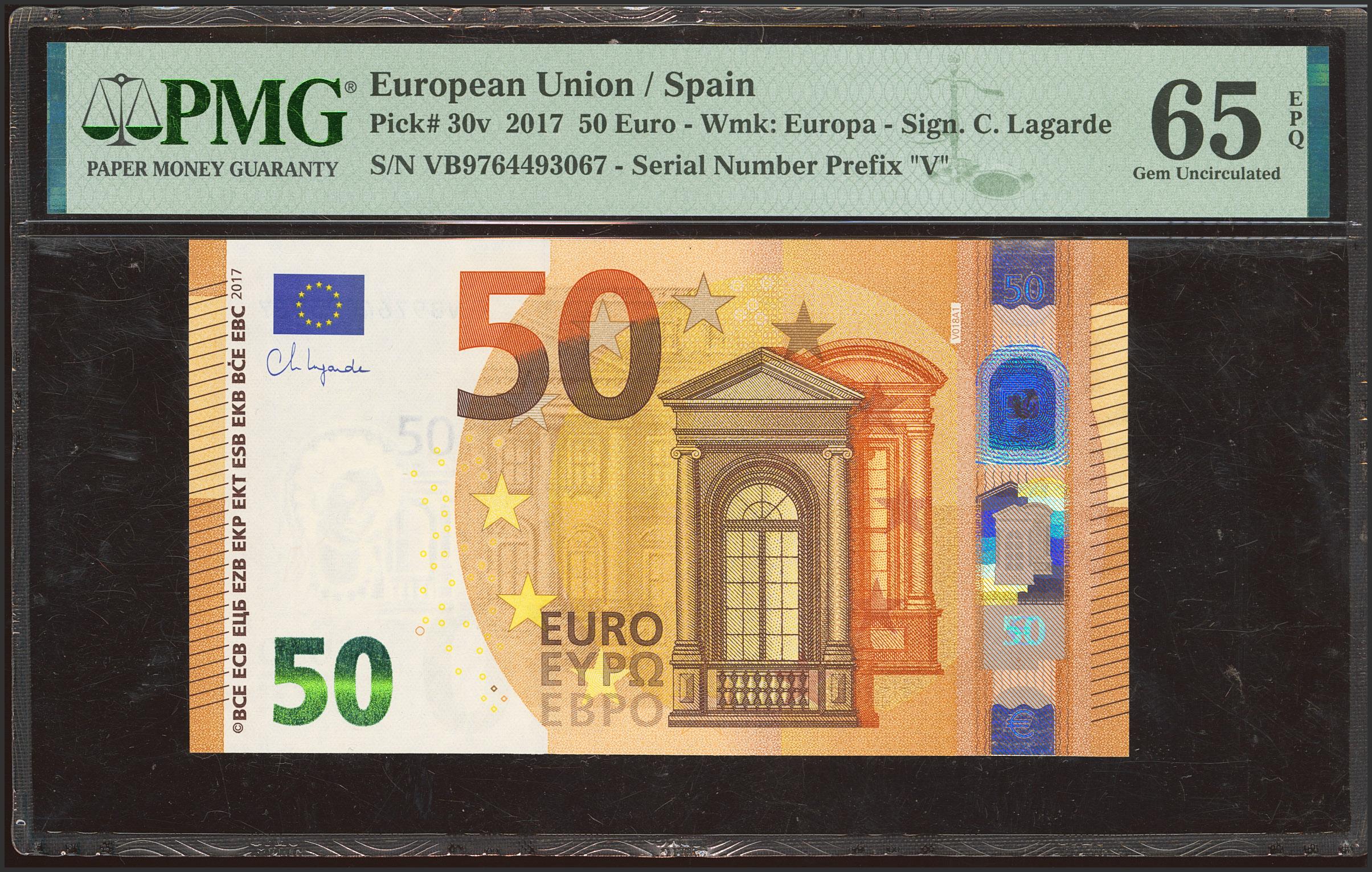 50 Euros. April 4, 2017. Signed by Lagarde. Series V (Spain). (Edifil 2023: 496A, Pick: 30v). Uncirculated. PMG65EPQ encapsulation.