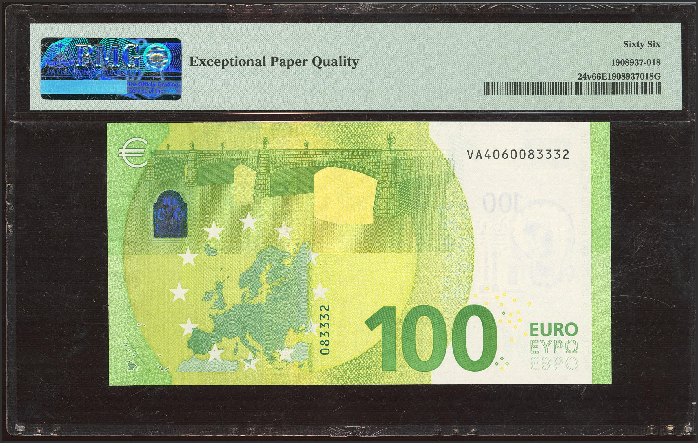 100 Euros. May 28, 2019. Signed by Draghi. Series V (Spain). (Edifil 2021: 497, Pick: 24v). Uncirculated. PMG66EPQ encapsulation.