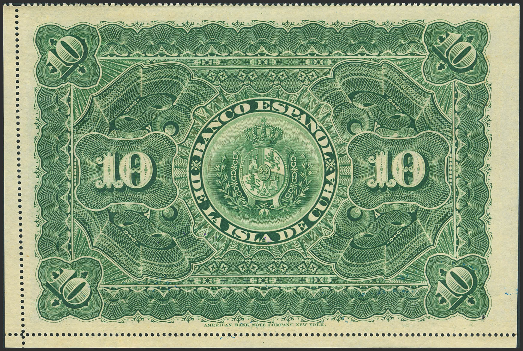 SPANISH BANK OF THE ISLAND OF CUBA. 10 Pesos. May 15, 1896, dated with stamp. (Edifil 2023: 72a). Original printing. Uncirculated.