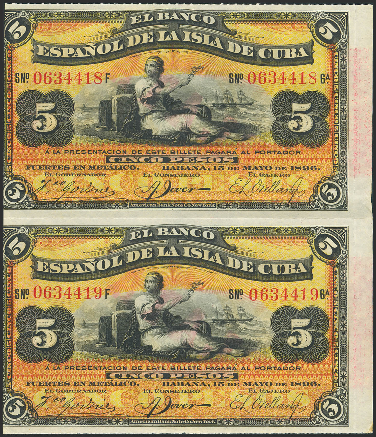 English BANCO ESPAÑOL DE LA ISLA DE CUBA. Set of two consecutive 5-peso banknotes (undetached), issued on May 15, 1896, series F, with a silver overprint on the back. (Edifil 2023: 81). Rare. Fine.