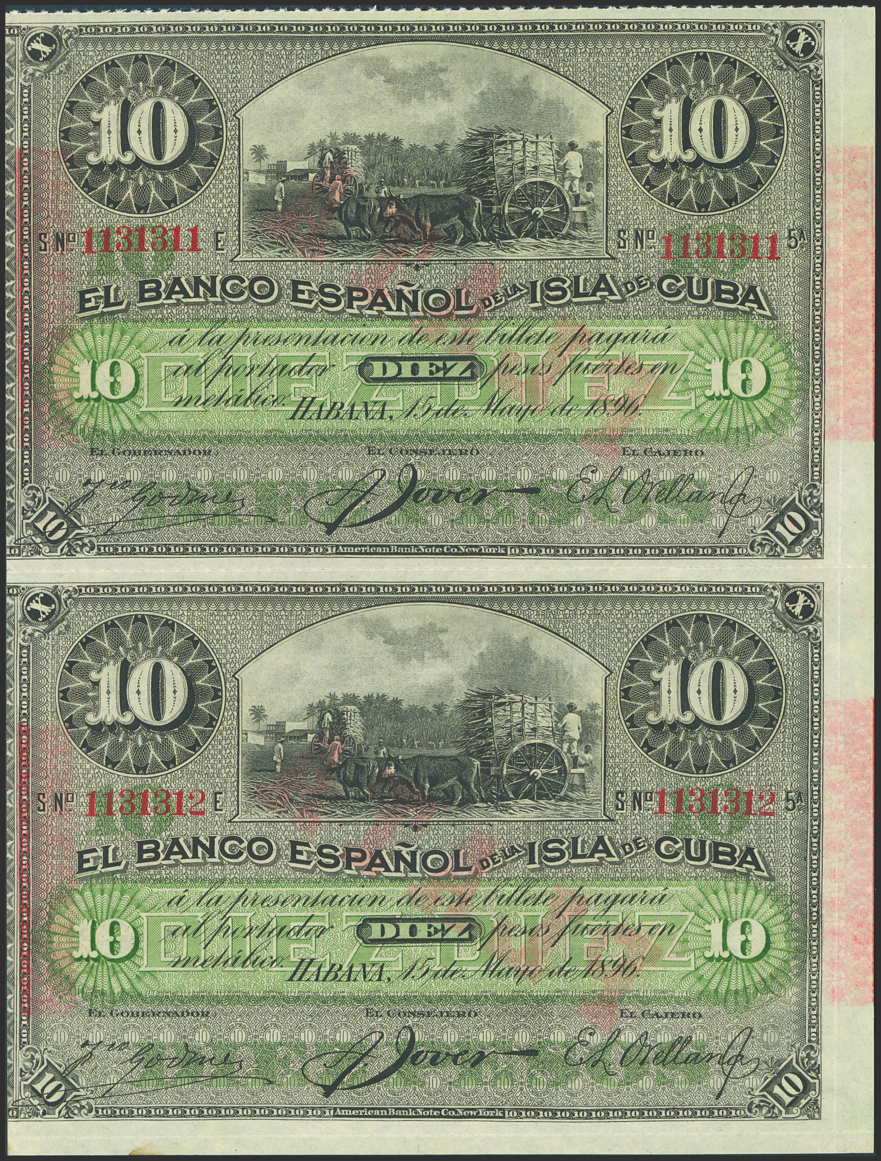 BANCO ESPAÑOL DE LA ISLA DE CUBA. Set of two consecutive 10 Peso banknotes (undetached), issued on May 15, 1896, with a silver overprint on the reverse. (Edifil 2023: 82). Original size, one needlepoint banknote; this is not a defect; all banknotes in that position have it due to the printing system. Uncirculated.