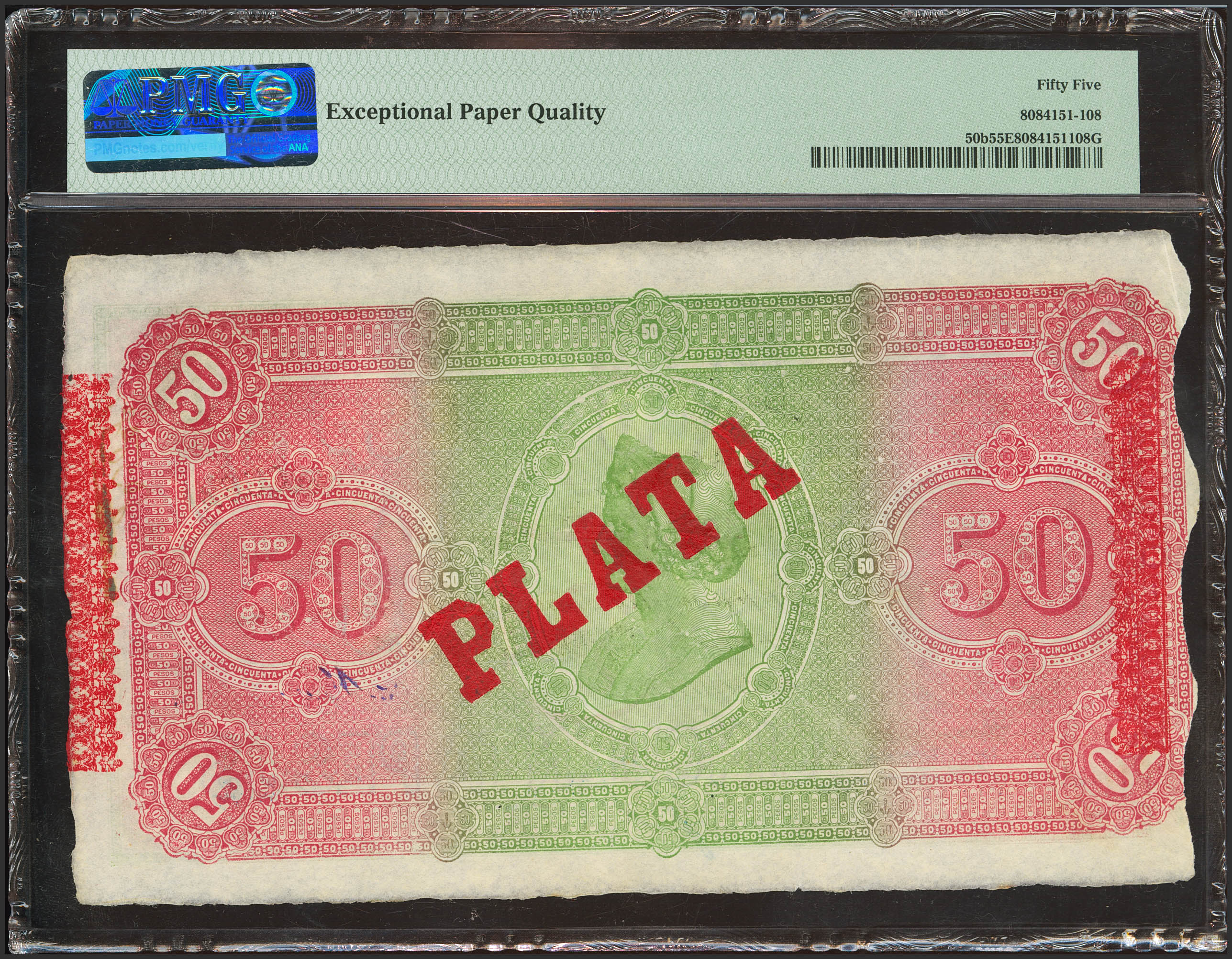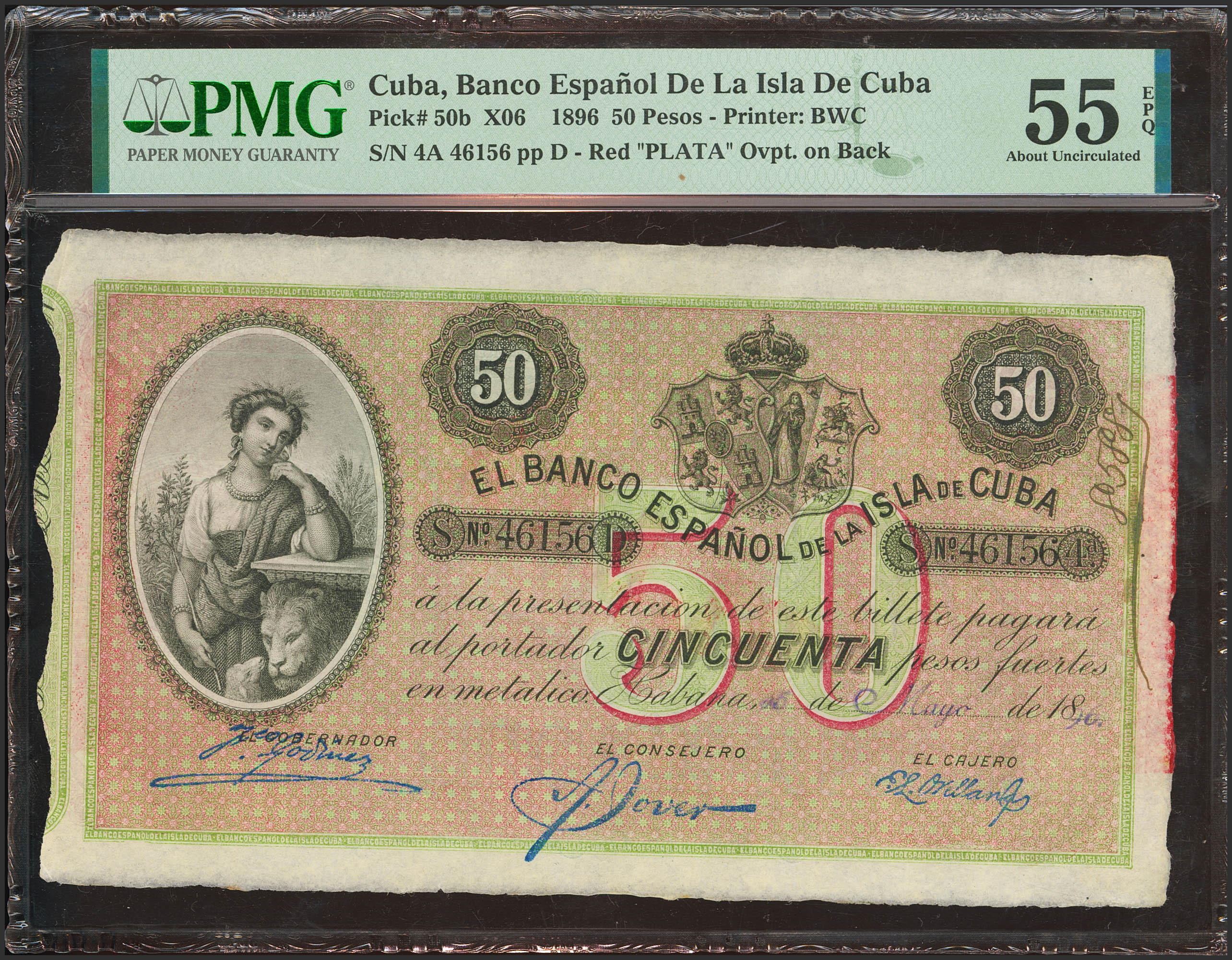Spanish Bank of the Island of Cuba. 50 Pesos. May 15, 1896. Series D and with the Silver surcharge on the reverse. (Edifil 2023: 83, Pick: 50b). Original finish. Good Extremely Fine. Encapsulated in PMG55EPQ.