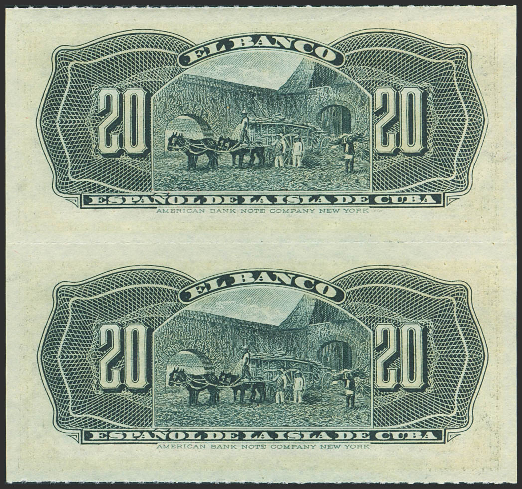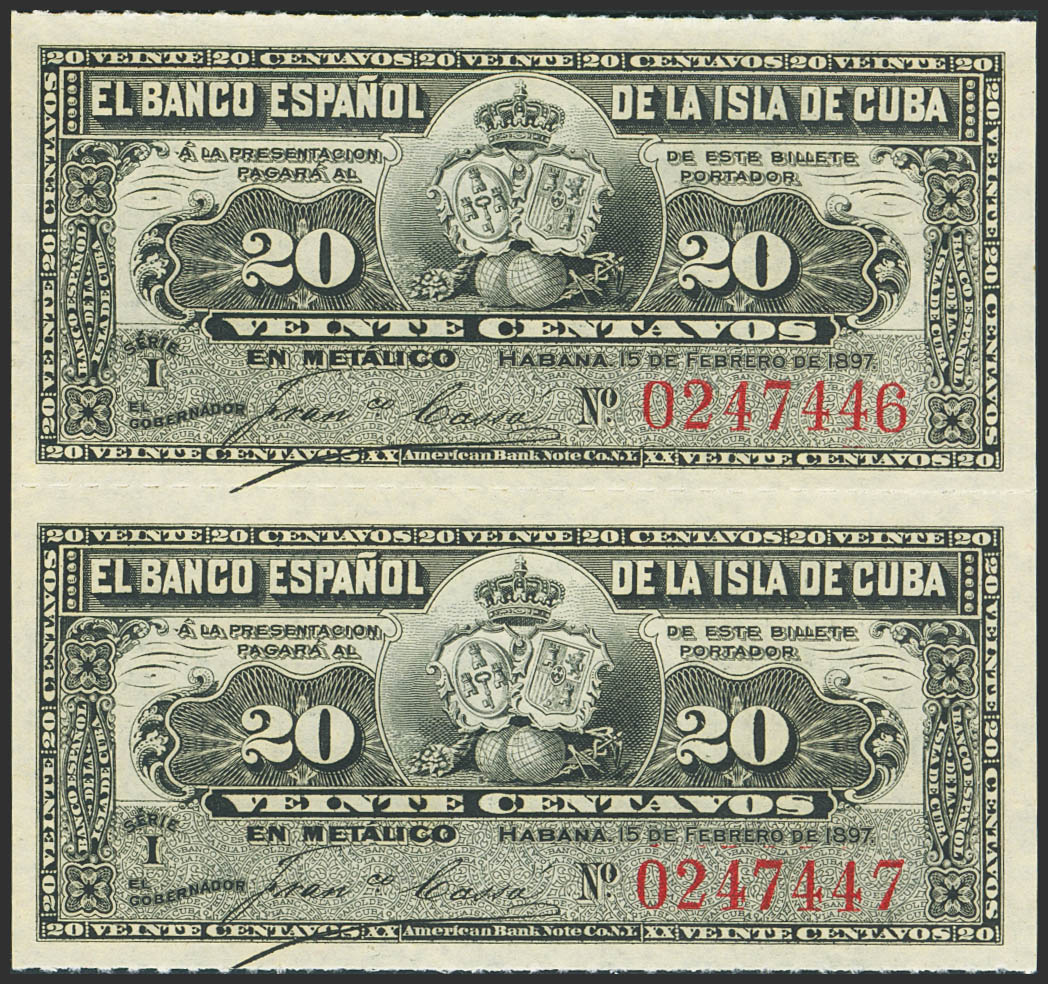 SPANISH BANK OF THE ISLAND OF CUBA. 20 Cents. February 15, 1897. Correlative pair (undetached). Series I. (Edifil 2023: 85). Uncirculated.
