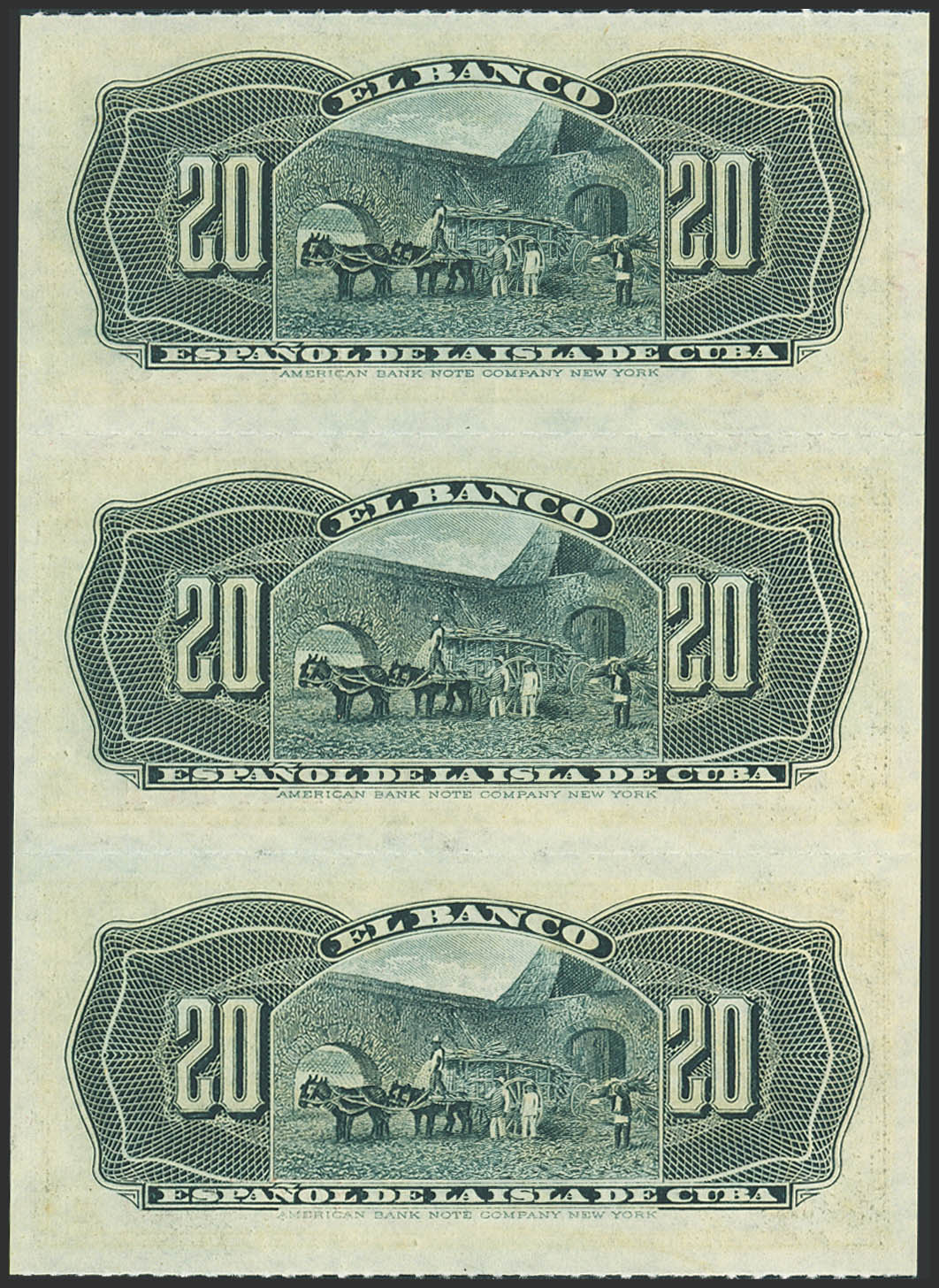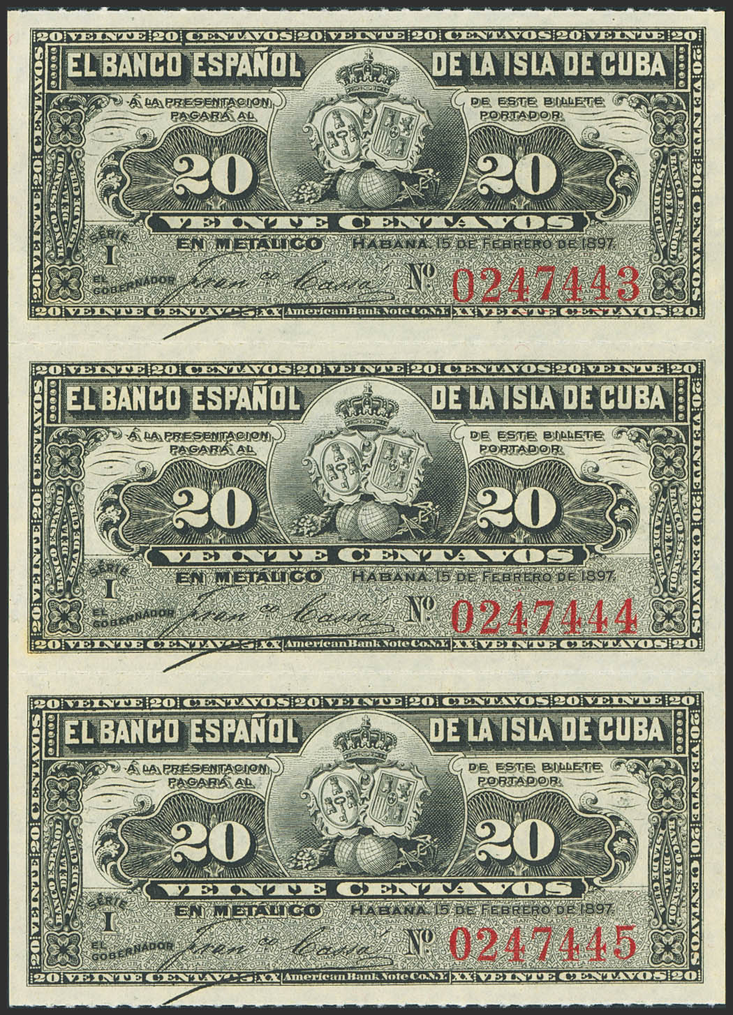 SPANISH BANK OF THE ISLAND OF CUBA. Set of three consecutive 20-centavo banknotes (undetached), issued on February 15, 1897 (Edifil 2023: 85, Pick: 53a). Original printing. Unused.