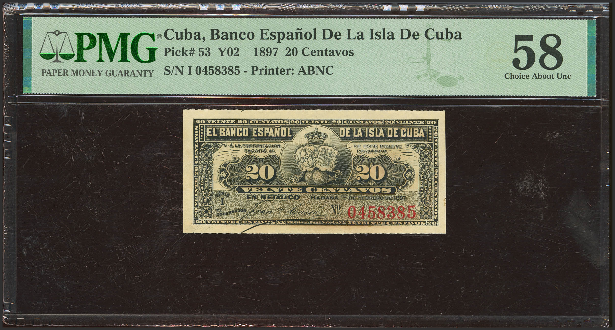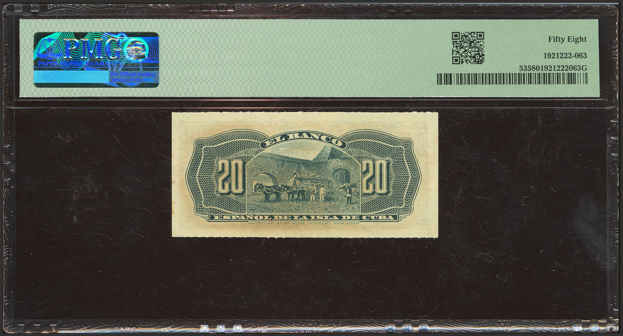 SPANISH BANK OF THE ISLAND OF CUBA. 20 Cents. February 15, 1897. Series I. (Edifil 2023: 85, Pick: 53). Good Extremely Fine+. PMG58 encapsulation.