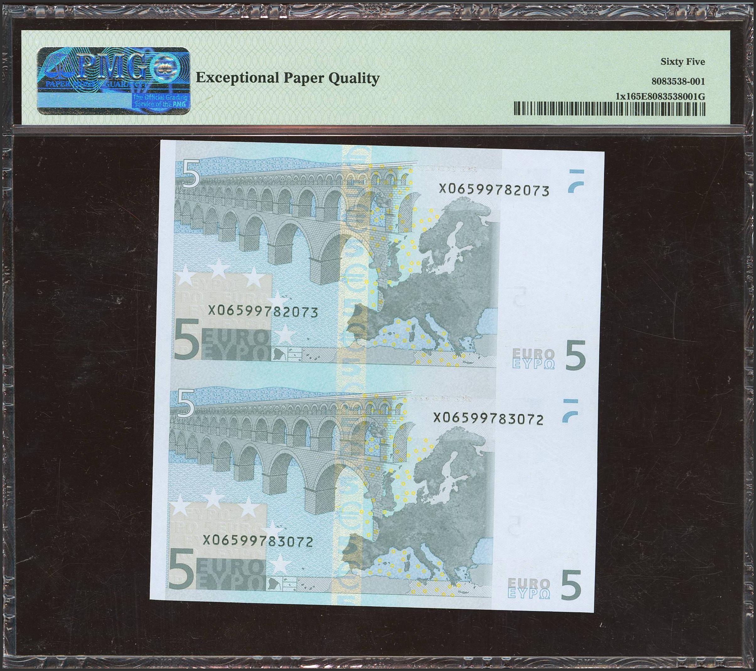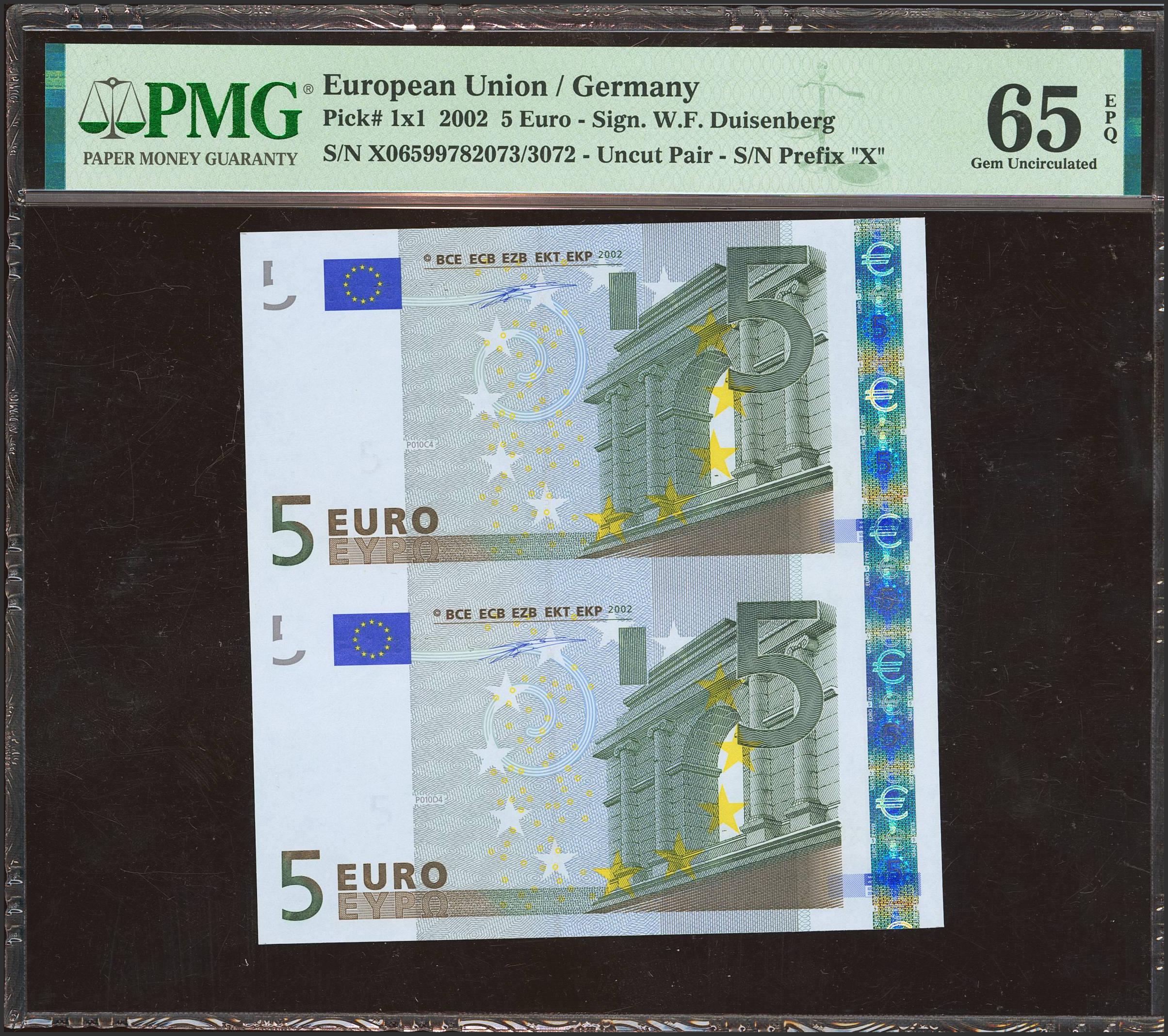 GERMANY. 5 Euros. 2002. Signature Duisenber. Serial X (Germany). Unguillotined couple. (Pick: 1x1). PMG65EPQ.