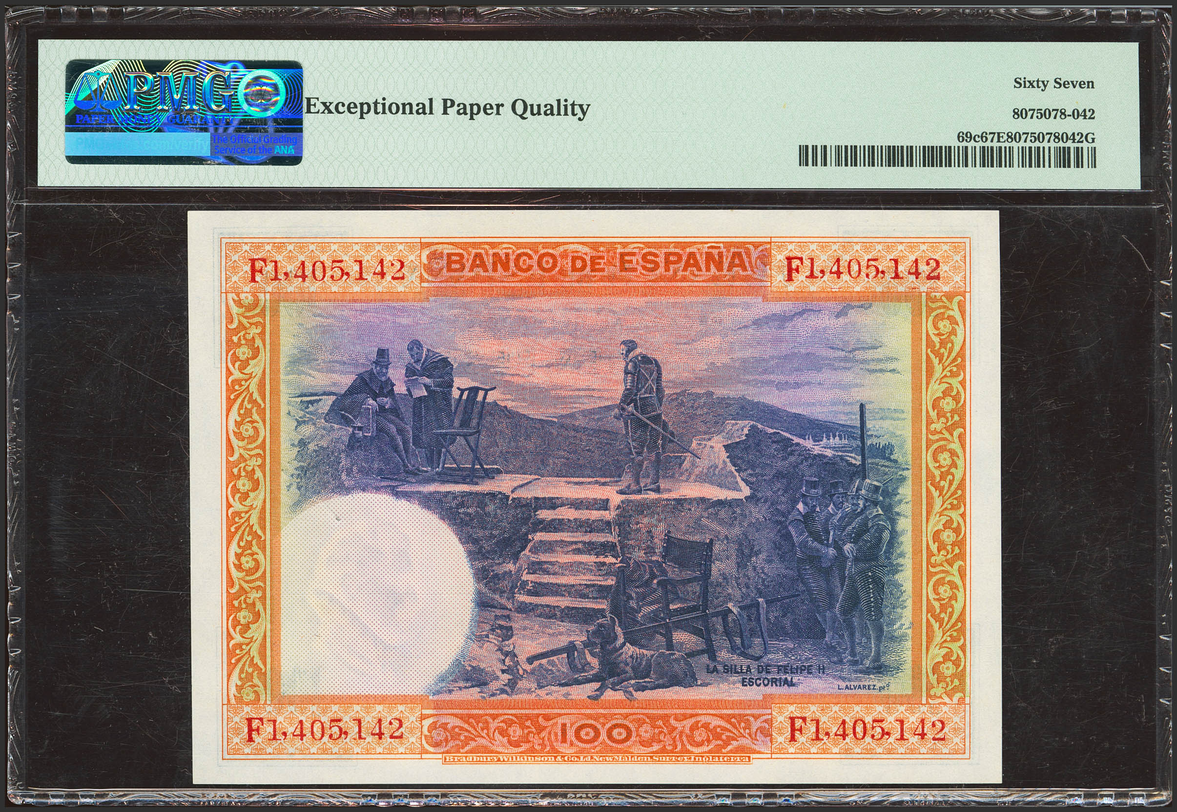 100 Pesetas. June 1, 1925. Series F. (Edifil 2023: 350, Pick: 69c). Original Uncirculated coating. Encapsulated in PMG67EPQ.