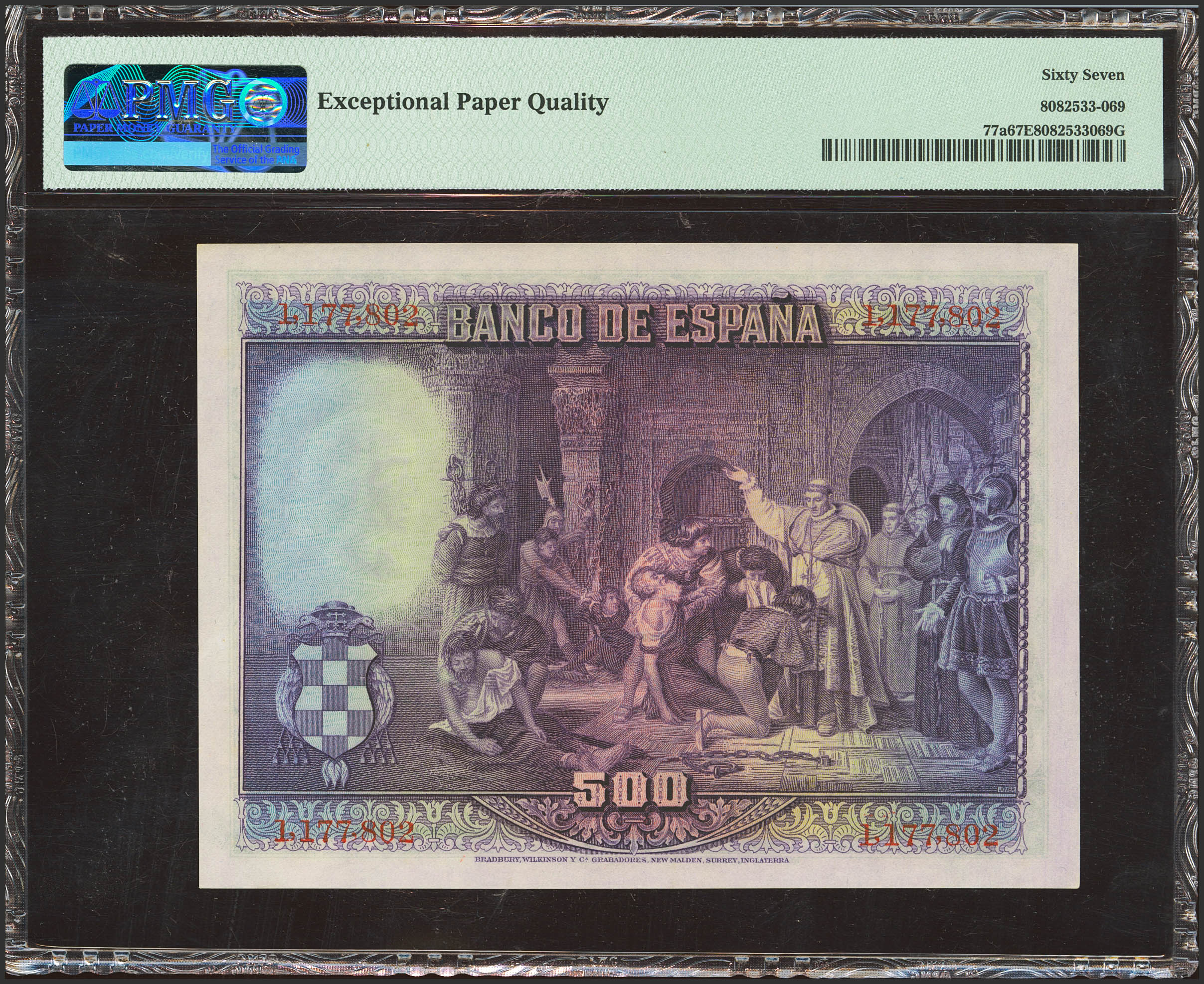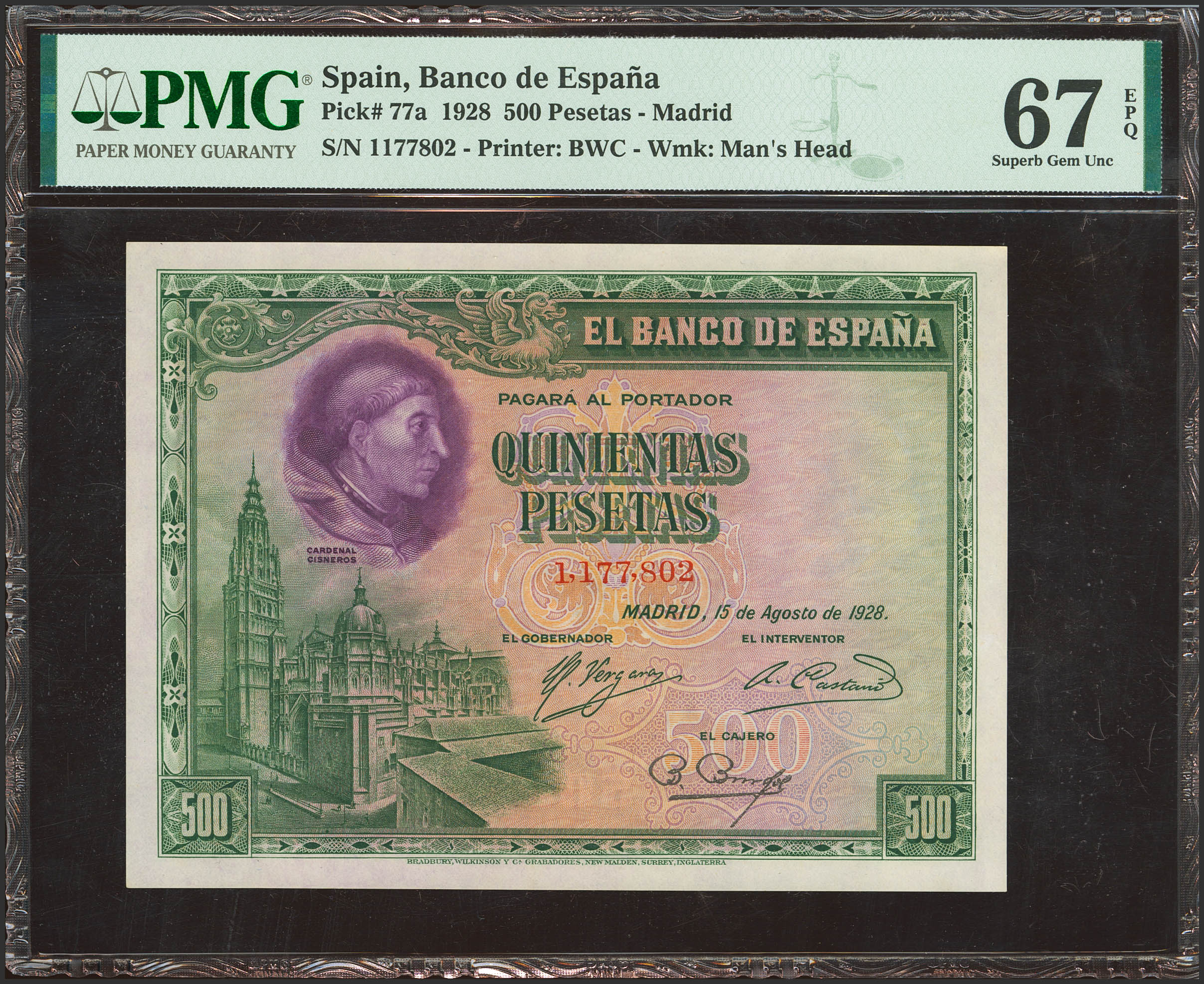 500 Pesetas. August 15, 1928. No serial number. (Edifil 2023: 356, Pick: 77a). Original size. Uncirculated. Encapsulated PMG67EPQ.