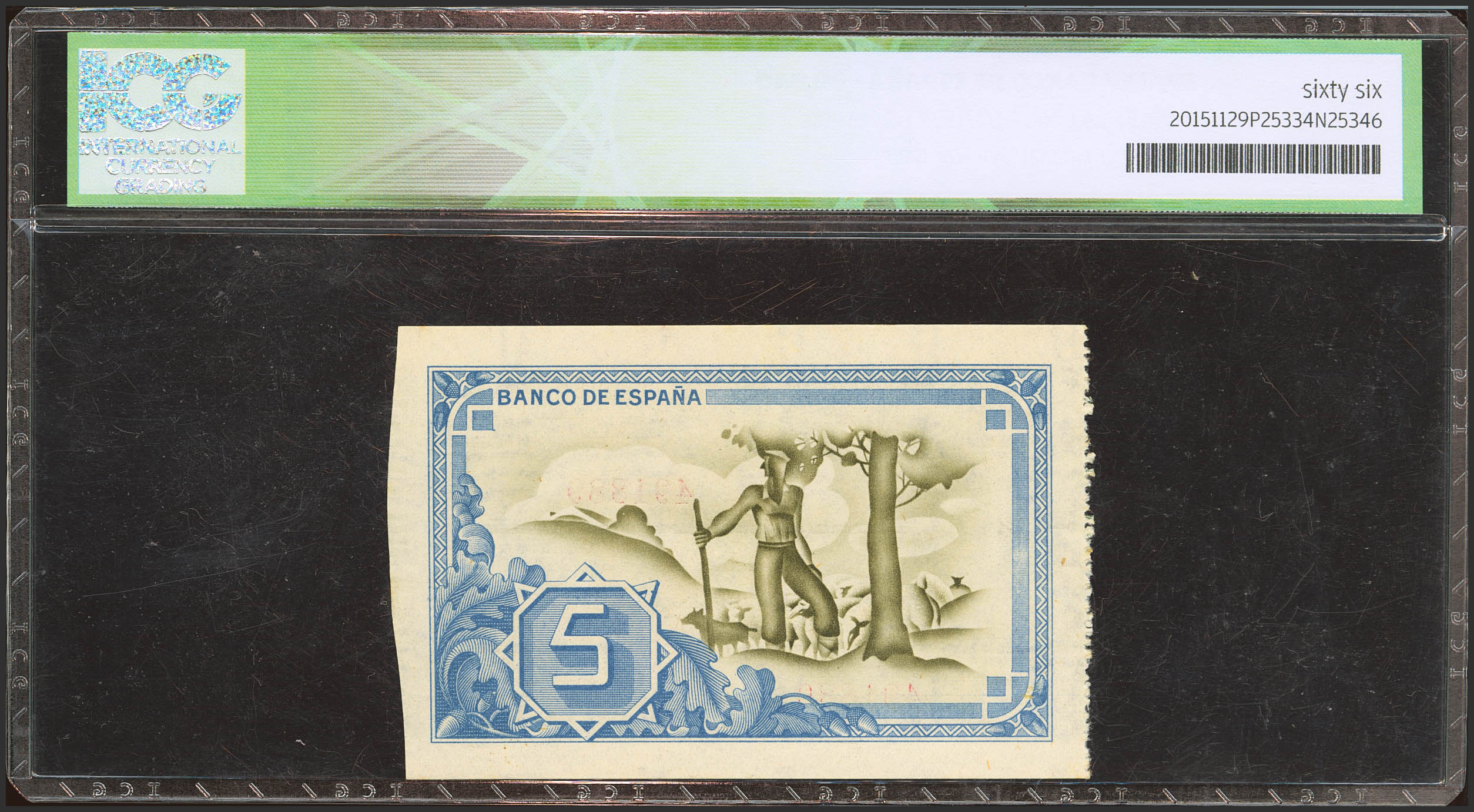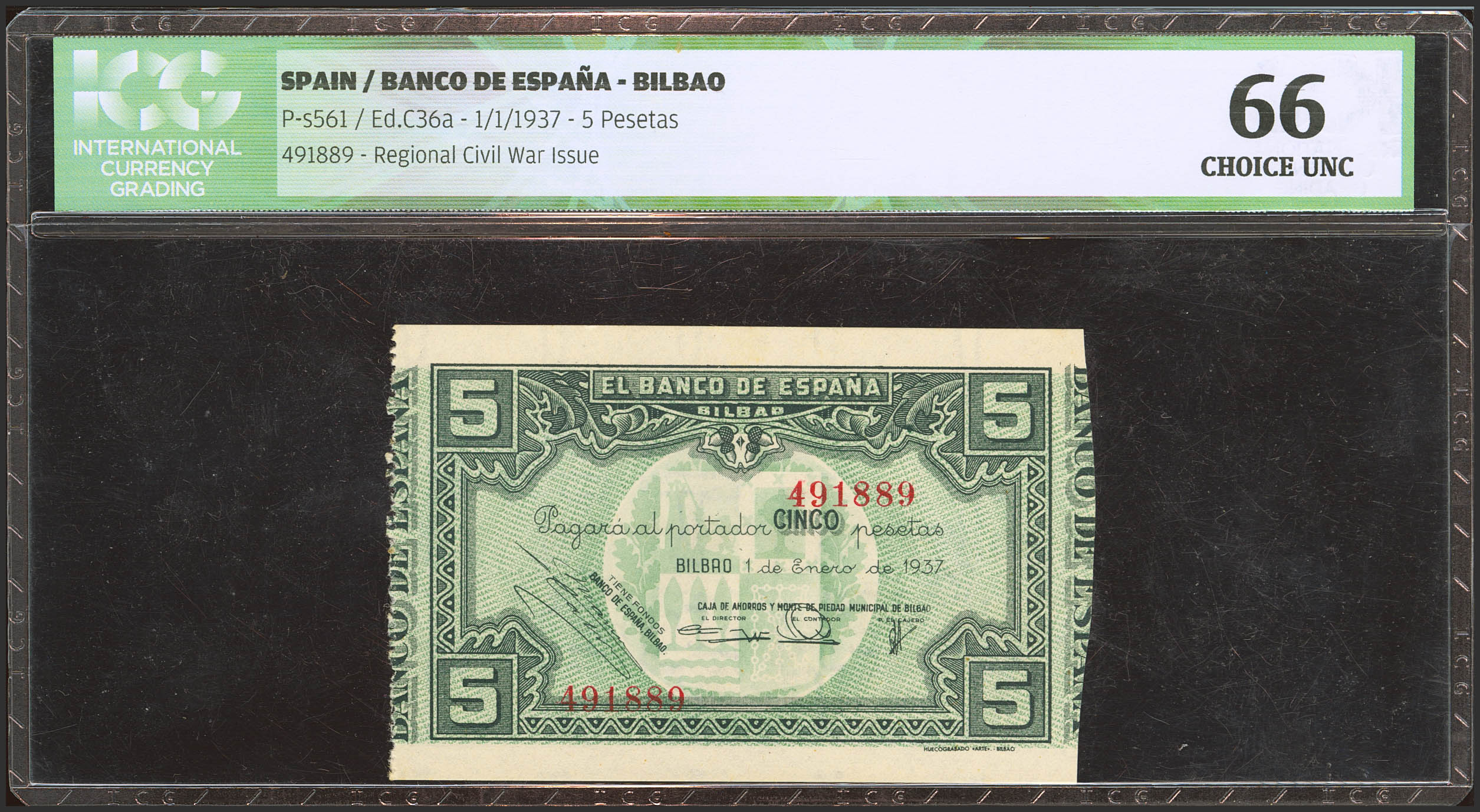 5 Pesetas. January 1, 1937. Bilbao branch, countersigned: Caja de Ahorros y Monte de Piedad Municipal de Bilbao. No serial number, with numbering and no dies. (Edifil 2023: 385a, Pick: S561h). Original size. Uncirculated. Encapsulated ICG66.