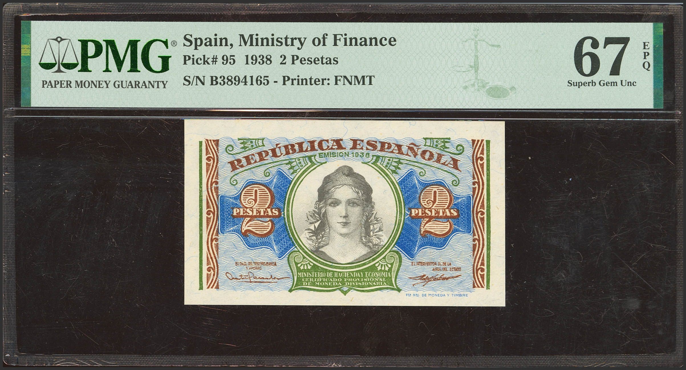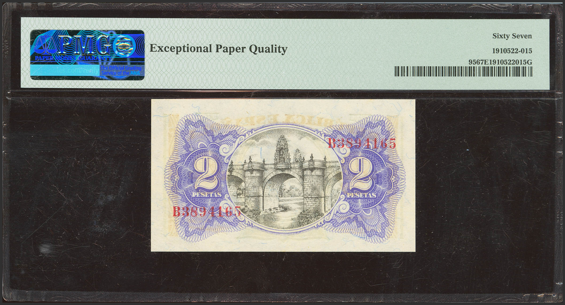 2 Pesetas. 1938. Ministry of Finance. Series B. (Edifil 2023: 393, Pick: 95). Original size. Uncirculated. Encapsulated PMG67EPQ.