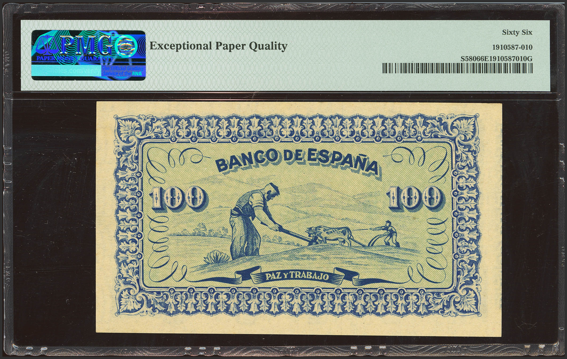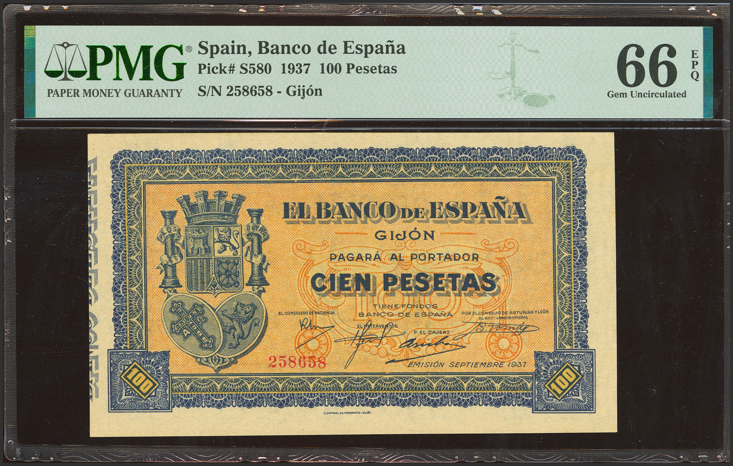 100 Pesetas. September 1937. Gijón branch. No serial number. (Edifil 2023: 399, Pick: S580). Unusual in this quality, original sizing. Unused. Encapsulated PMG66EPQ.