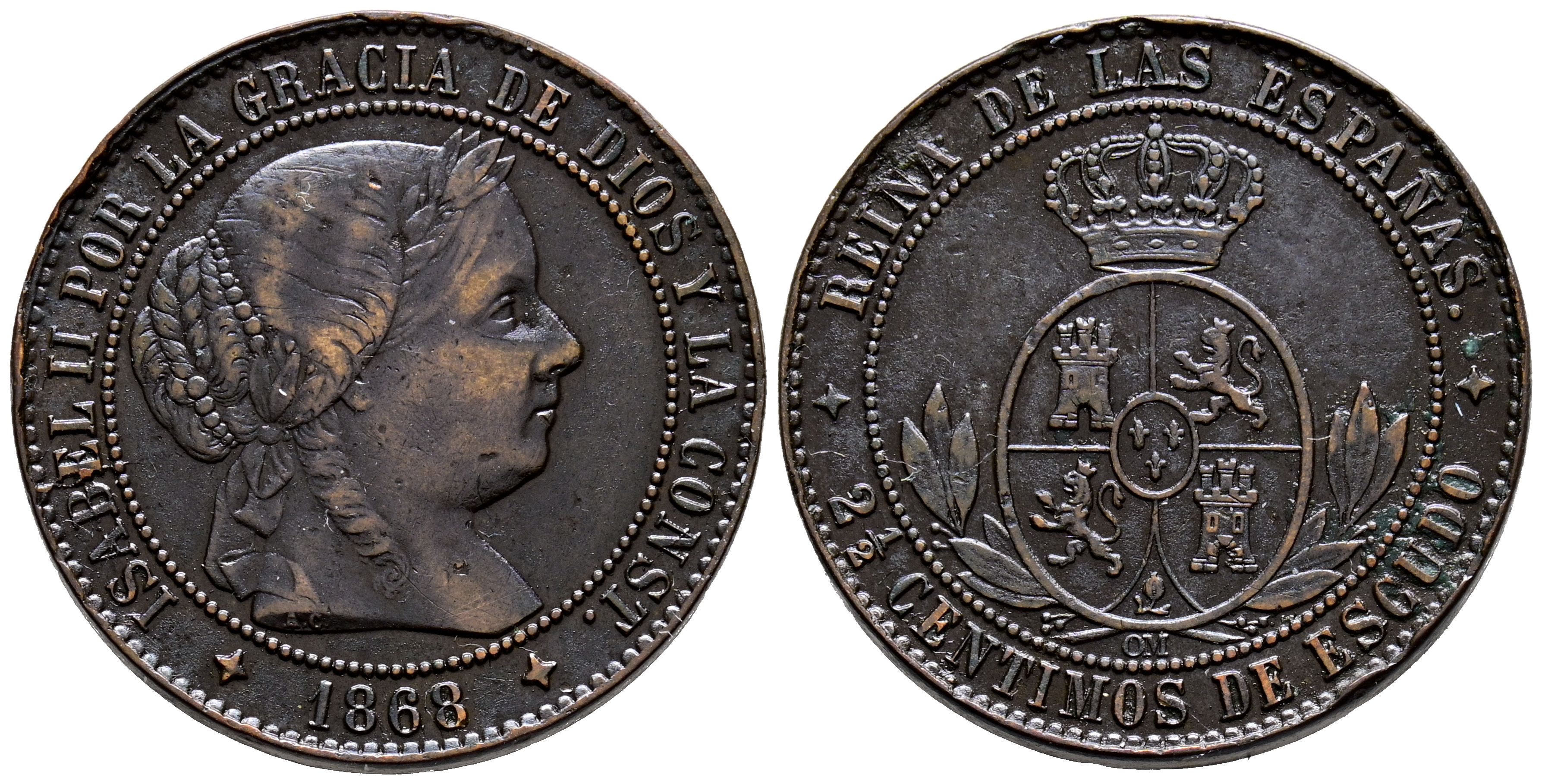 ELIZABETH II (1833-1868). 2 1/2 Escudo Cents. (Ae. 6.50g/25mm). 1868. Jubia OM. (Cal-2019-237). Good Very Fine. Dark patina.