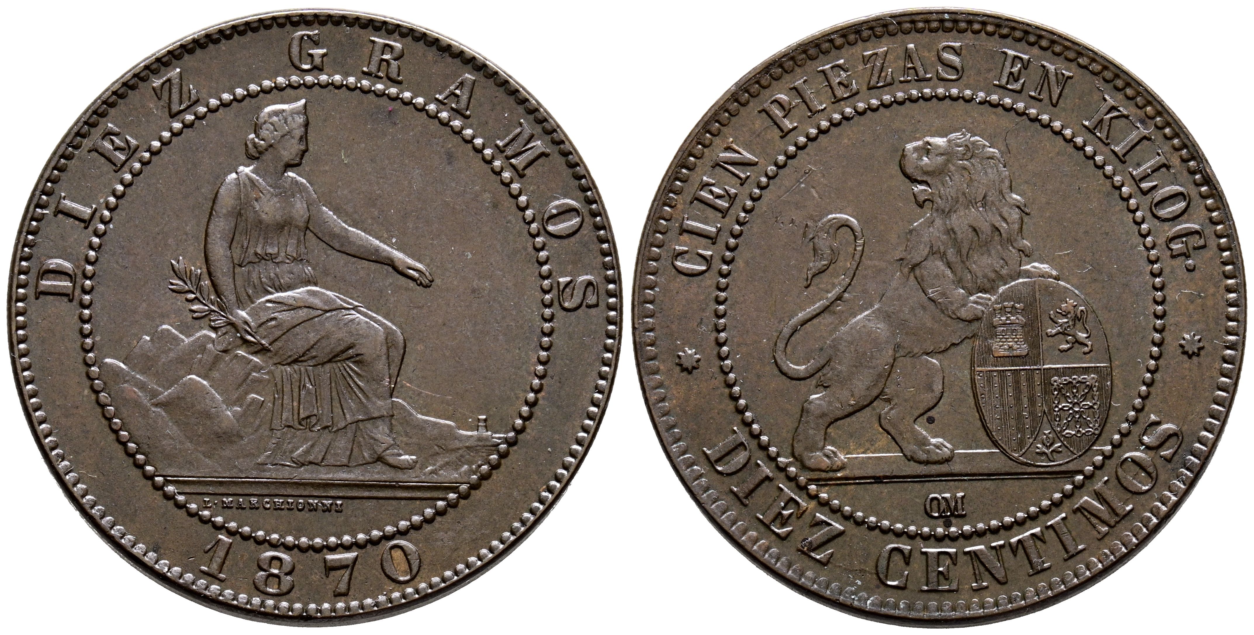 PROVISIONAL GOVERNMENT (1868-1871). 10 Cents. (Ae. 9.89g/30mm). 1870. Barcelona. (Cal-2019-8). Extremely Fine-.