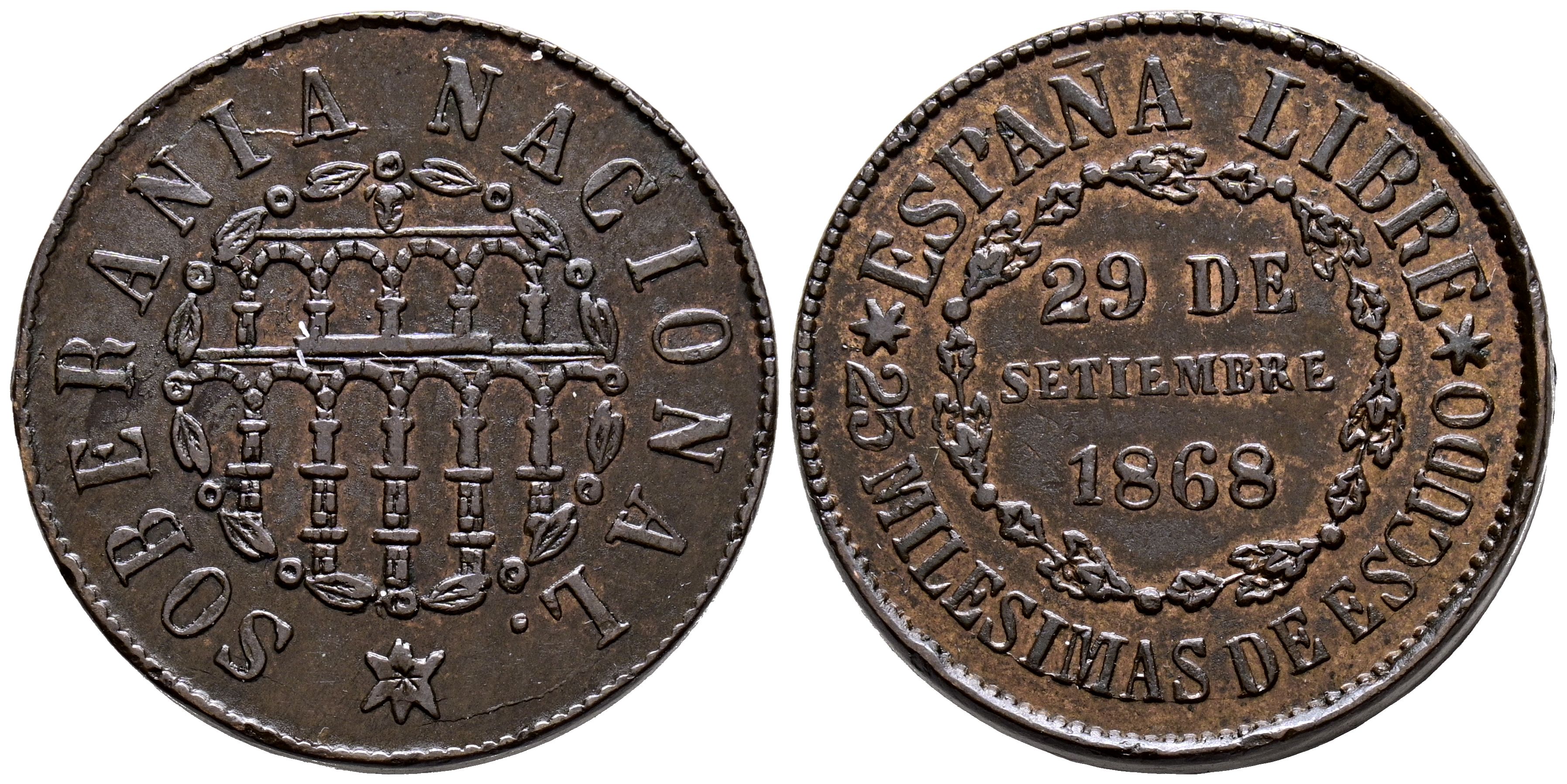 PROVISIONAL GOVERNMENT (1868-1871). 25 Thousandths of a Escudo. (Ae. 6.46g/25mm). 1868. Segovia. (Cal. 2019-10). Extremely Fine. Some light dents on the listel. Scarce.