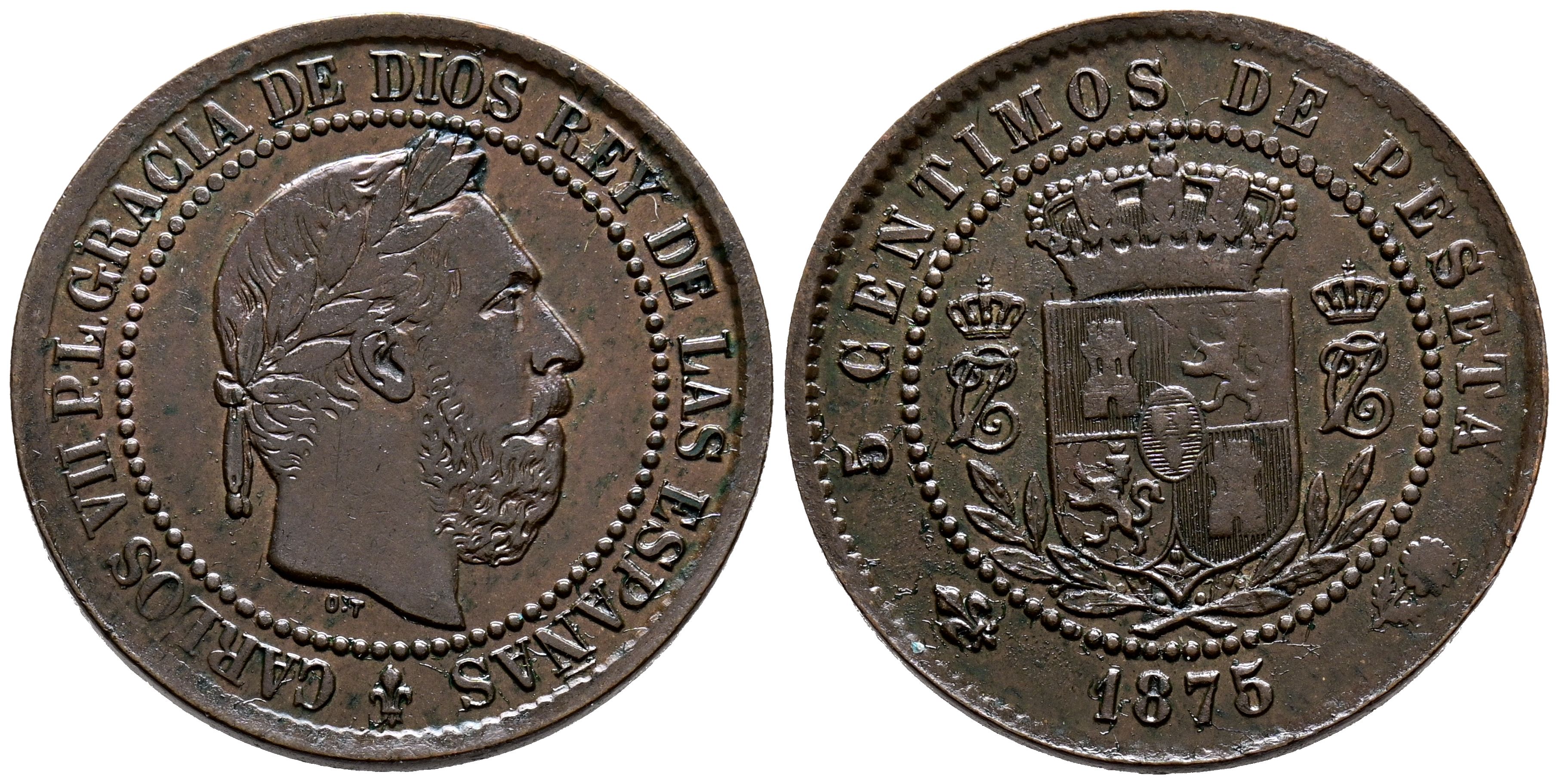 CHARLES VII (1868-1909). 5 Cents. (Ae. 4.83g/25mm). 1875. Oñate. (Cal. 2019-2). VF+. Matching reverse.