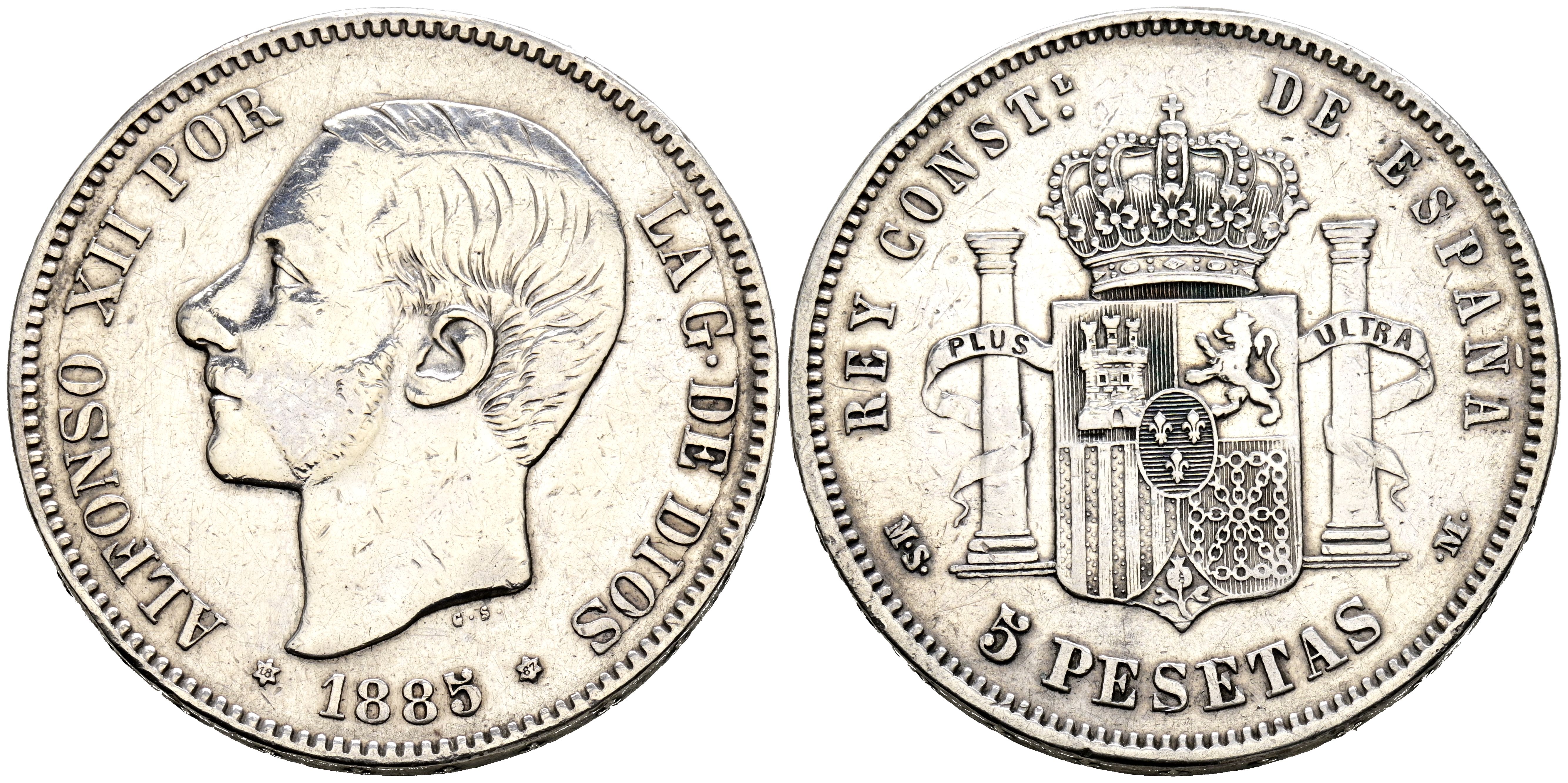 ALFONSO XII (1874-1885). 5 Pesetas. (Ar. 24.85g/38mm). 1885 *18-87. Madrid MSM. (Cal-2019-62). Minted during the reign of Alfonso XIII. VF-. Glossy finish.