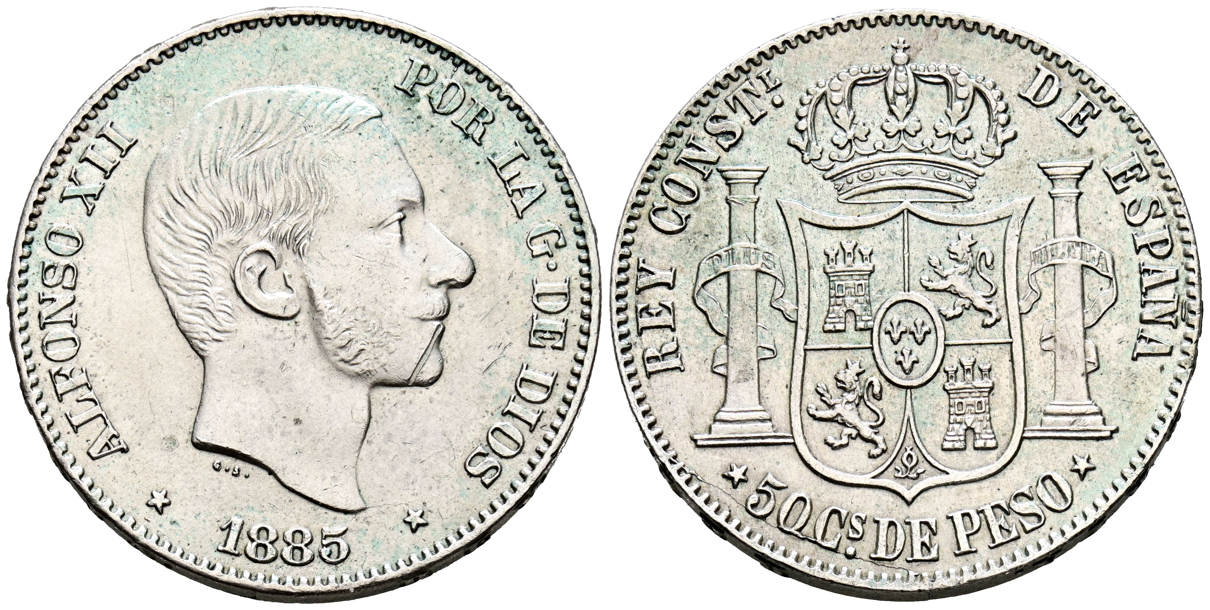 ALFONSO XII (1874-1885). 50 Cents. (Ar. 12.97g/30mm). 1885. Manila. (Cal-2019-124). Extremely Fine-. Stripes on obverse.