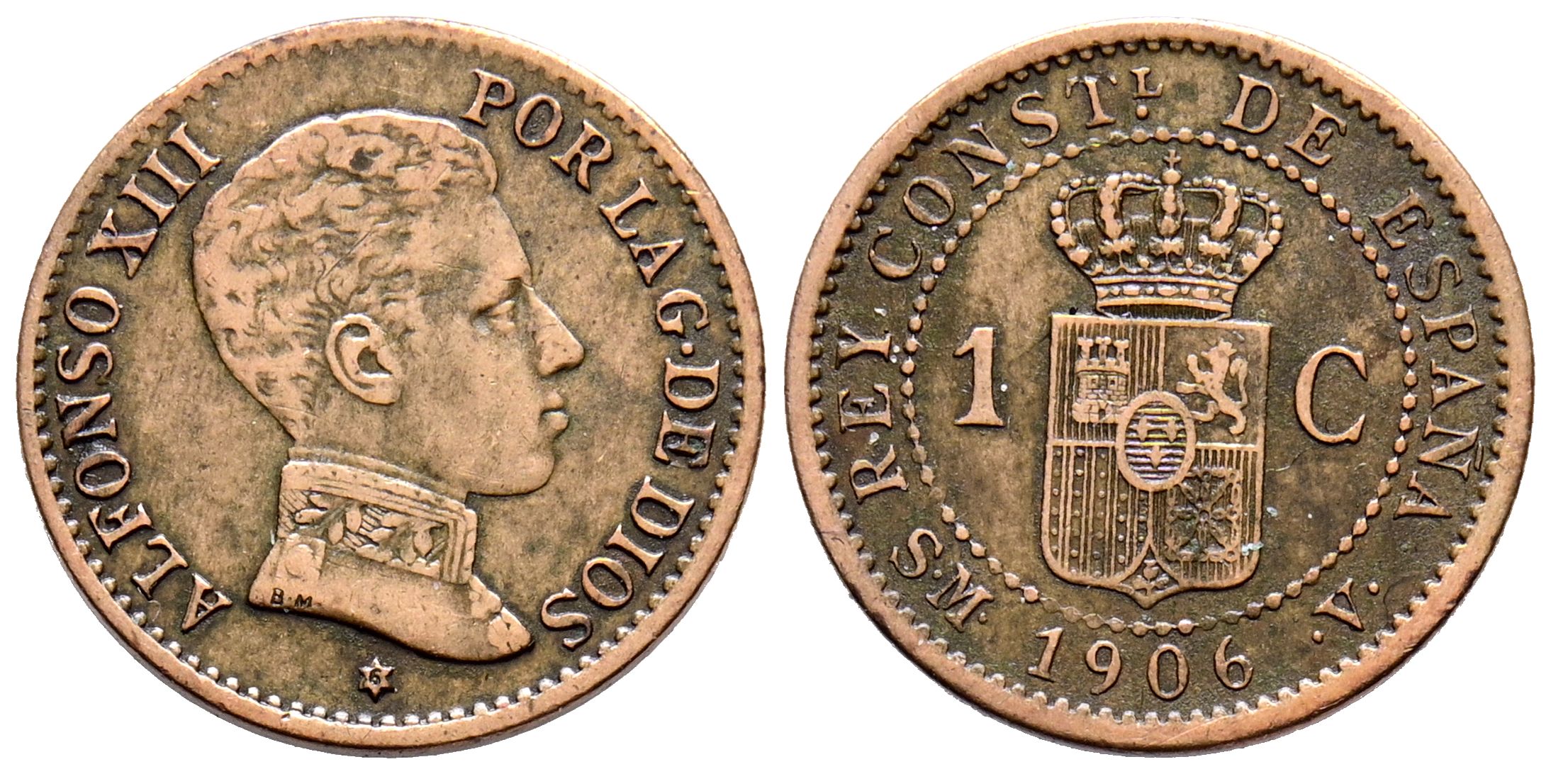 ALFONSO XIII (1885-1931). 1 Cent (Ae. 0.96g/15mm). 1906 *6. Madrid SMV. (Cal-2019-1). Very Fine-. Strange.