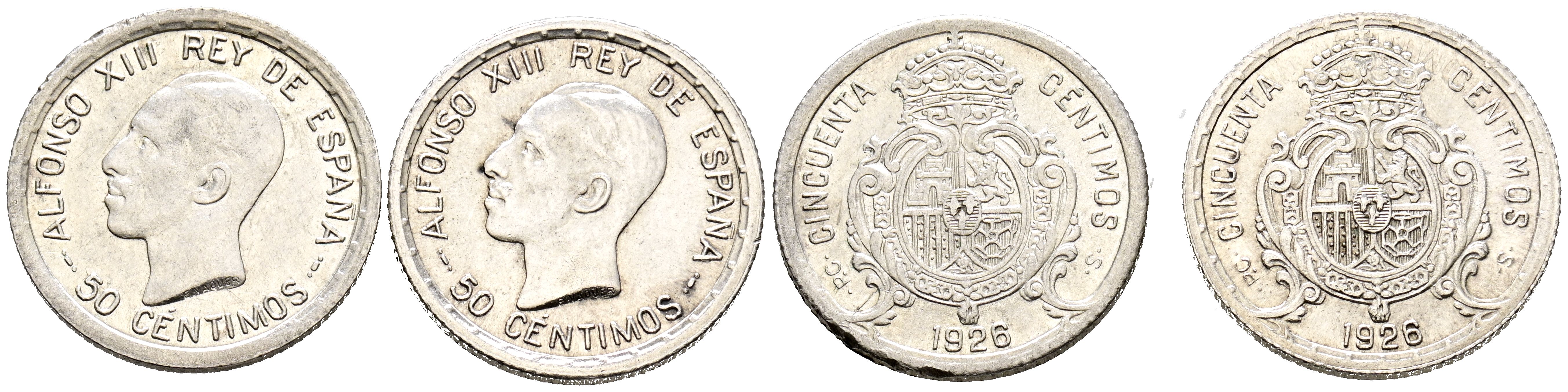 English Alfonso XIII (1885-1931). Pair of 50 Centimos from 1926. Madrid. (Cal. 2019-50). UNC. One of the coins bears remnants of the incuse legend from the obverse on the reverse. UNDER EXAMINATION.