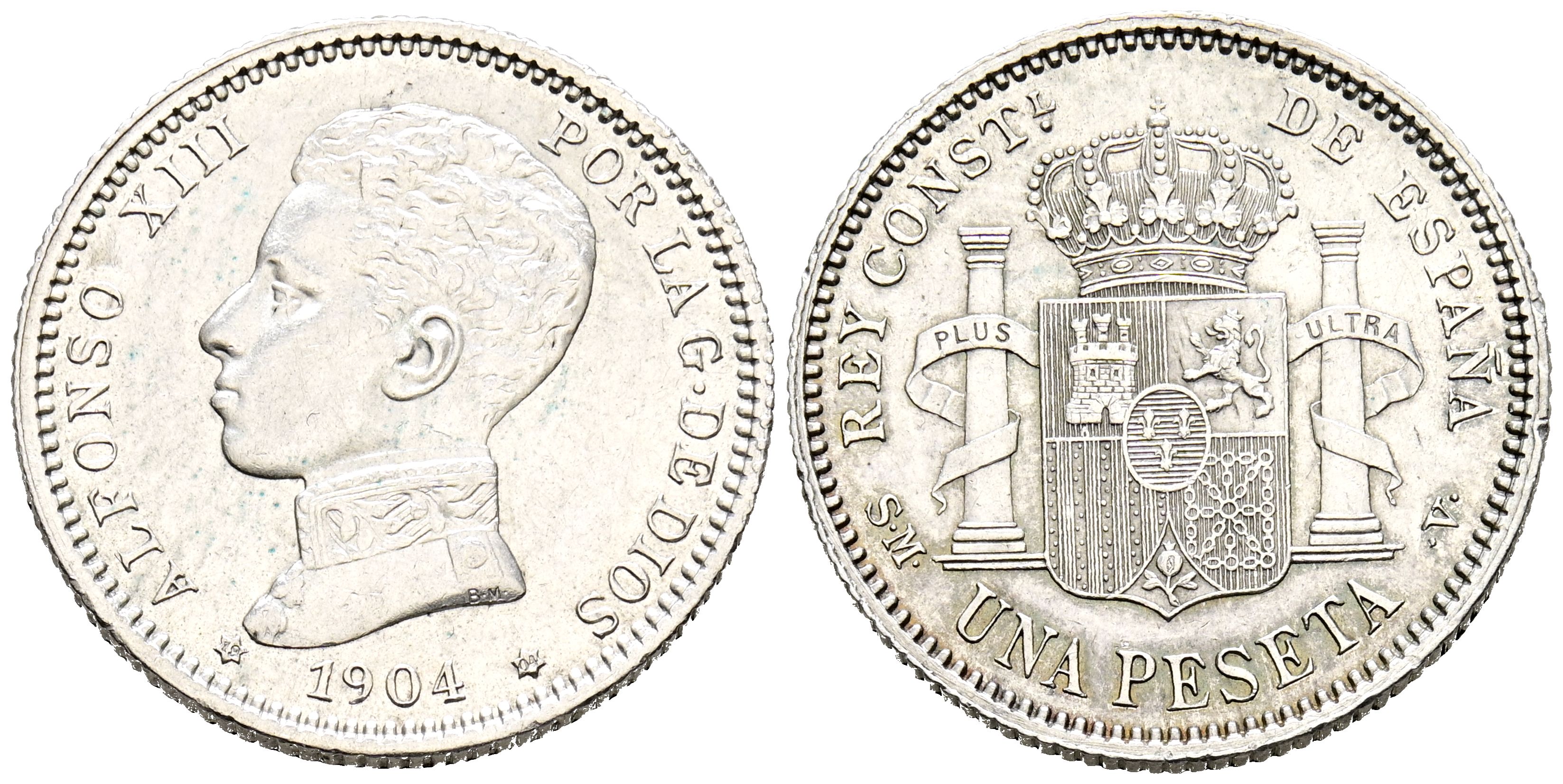 English Alfonso XIII (1885-1931). 1 Peseta. (Ar. 4.93g/23mm). 1904* 19-04. Madrid SMV. (Cal. 2019-68). UNC-. Striped.