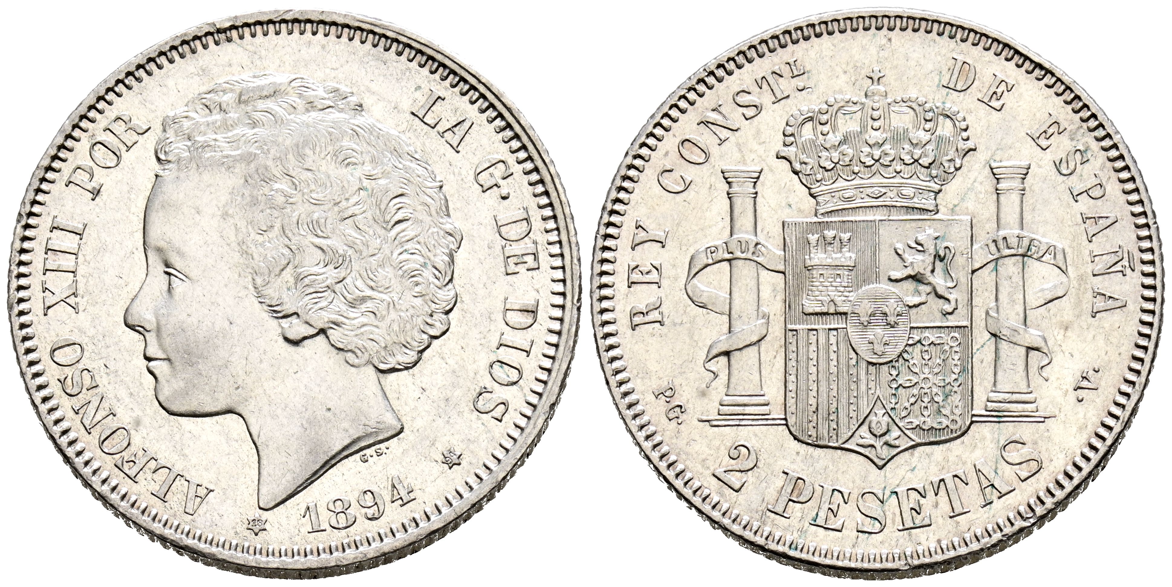 English Alfonso XIII (1885-1931). 2 Pesetas. (Ar. 10.00g/27mm). 1894 *18-94. Madrid PGV. (Cal. 2019-86). UNC/UNC-. Light scratches. Scarce.