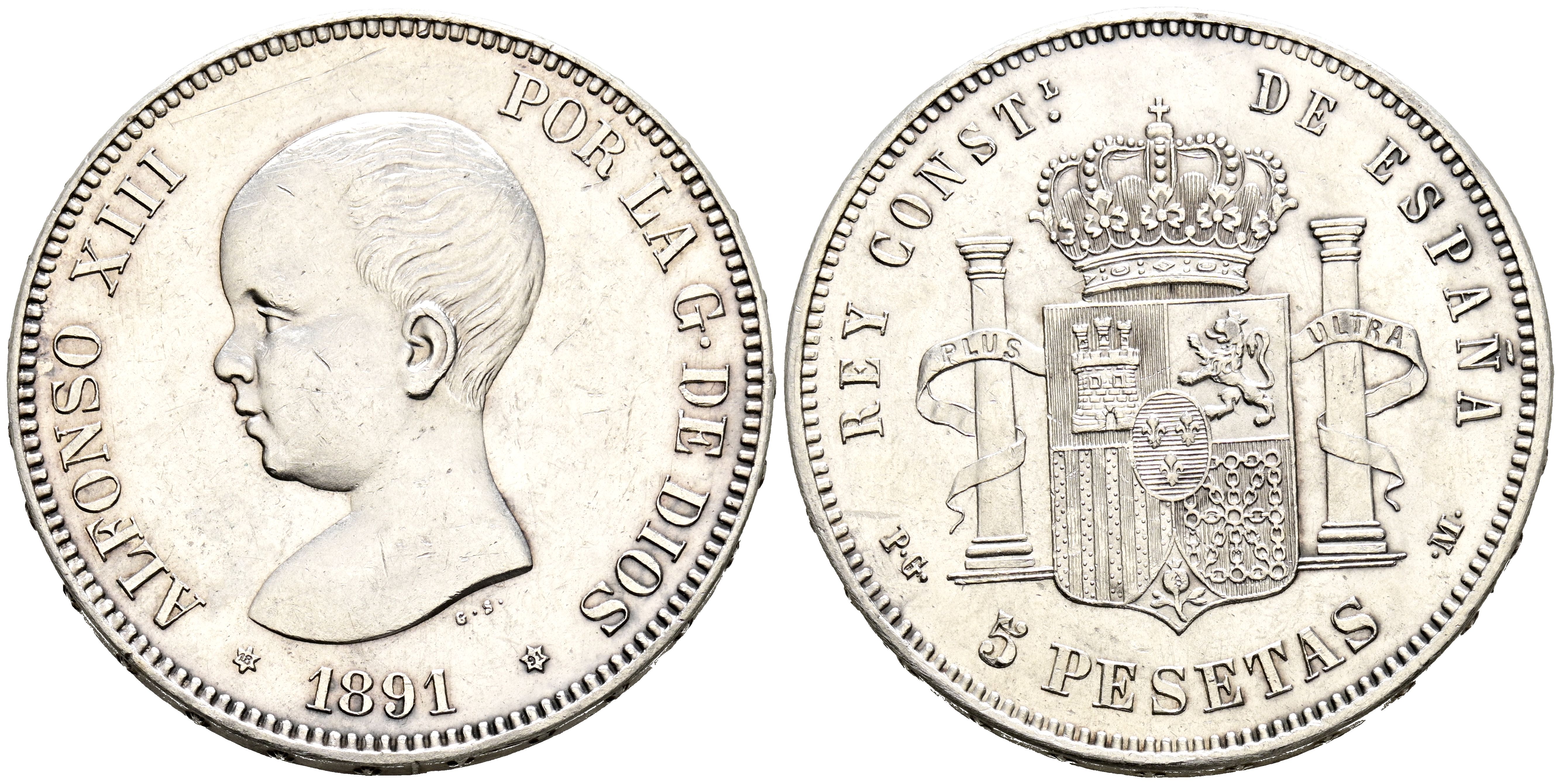 Alfonso XIII (1885-1931). 5 Pesetas. (Ar. 24.88g/37mm). 1891 *18-91. Madrid PGM. (Cal. 2019-98). Extremely Fine-. Traces of original luster.