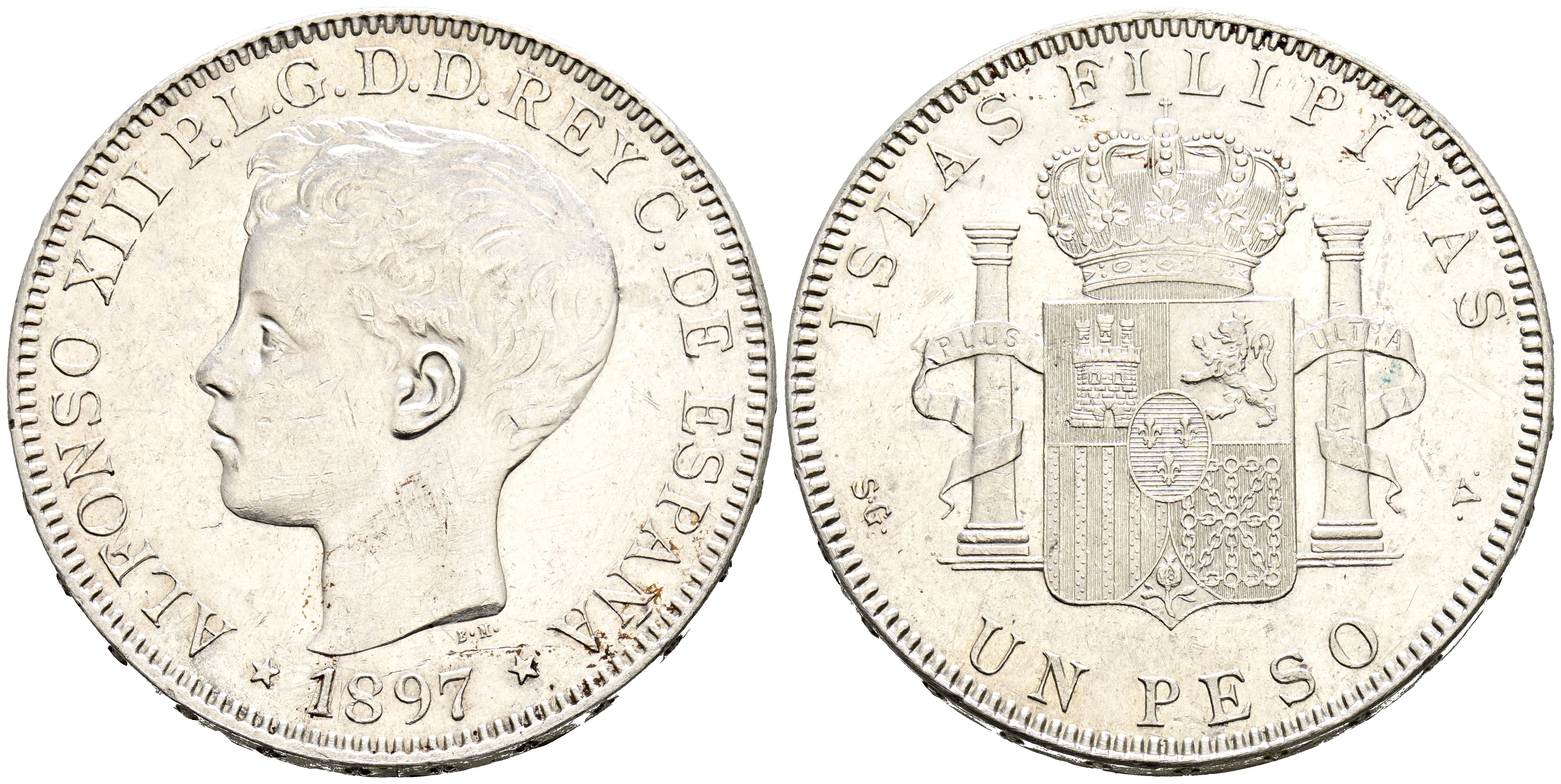 Alfonso XIII (1885-1931). 1 Peso. (Ar. 24.73g/37mm). 1897. Manila SGV. (Cal. 2019-122). Extremely Fine-/Extremely Fine. Scratches on the obverse. Traces of original luster.