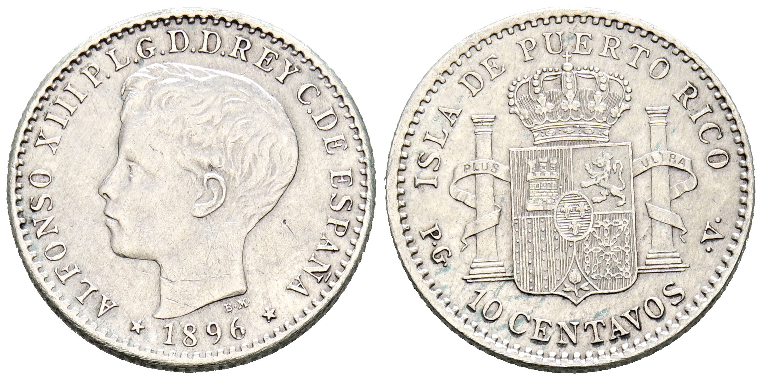 English Alfonso XIII (1885-1931). 10 Centavos. (Ar. 2.48g/18mm). 1896. Puerto Rico PGV. (Cal. 2019-125). VF+. Scarce.