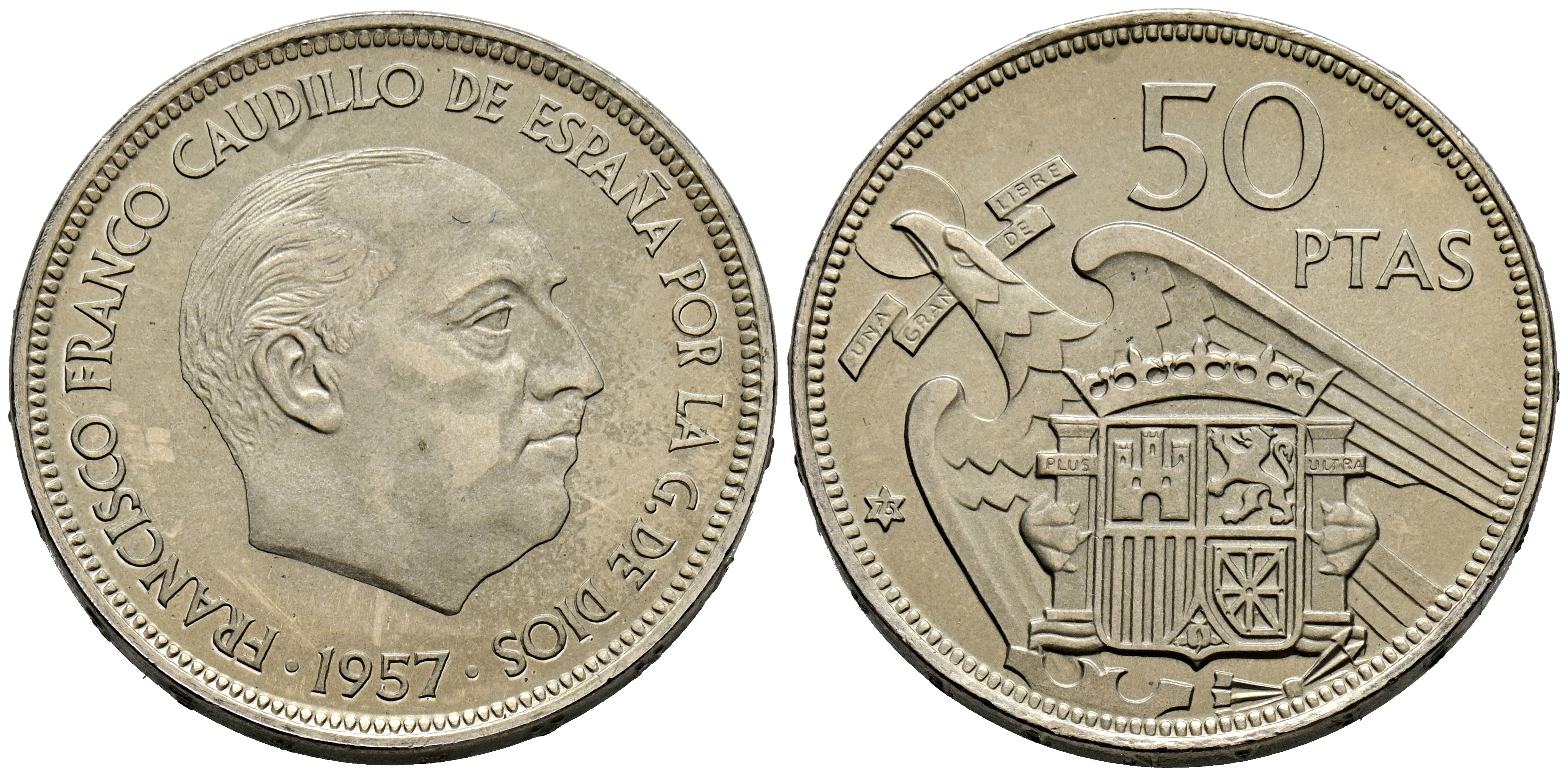SPANISH STATE (1936-1975). 50 Pesetas. (Ni. 12.41g/30mm). 1957 *75. Madrid. (Cal-2019-144). Uncirculated. Cartridge-minted. Beautiful luster.